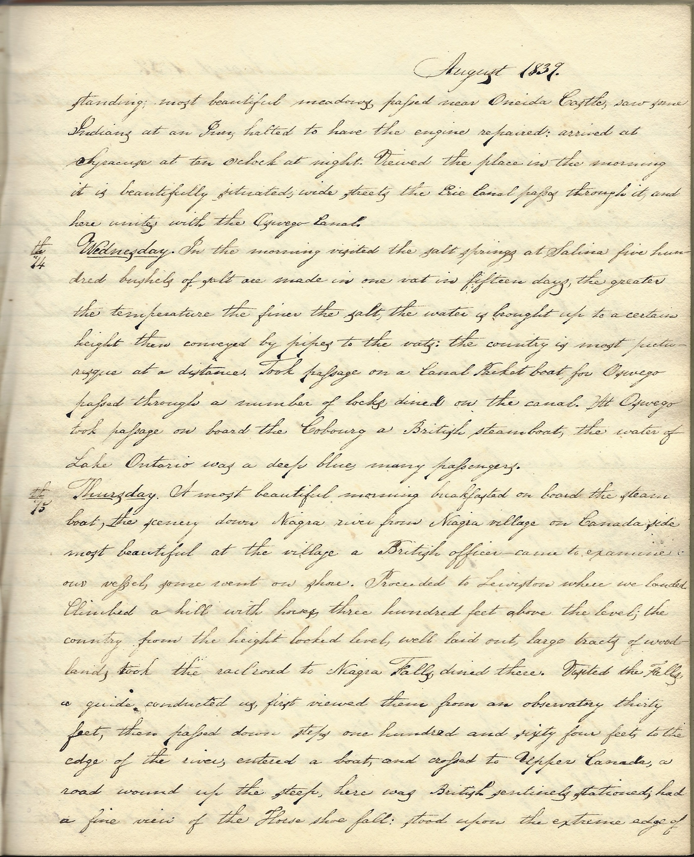 Thursday, August 15, 1839. A most beautiful morning. Breakfasted on board the steamer boat. The scenery down Niagara river from Niagara village on Canadian side most beautiful. At the village, a British officer came to examine our vessel. Soe went on shore. Proceeded to Lewiston where we landed. Climbed a hill with horses three hundred feet above the level. The country from the height looked level, well laid out. Large tracts of woodlands.
