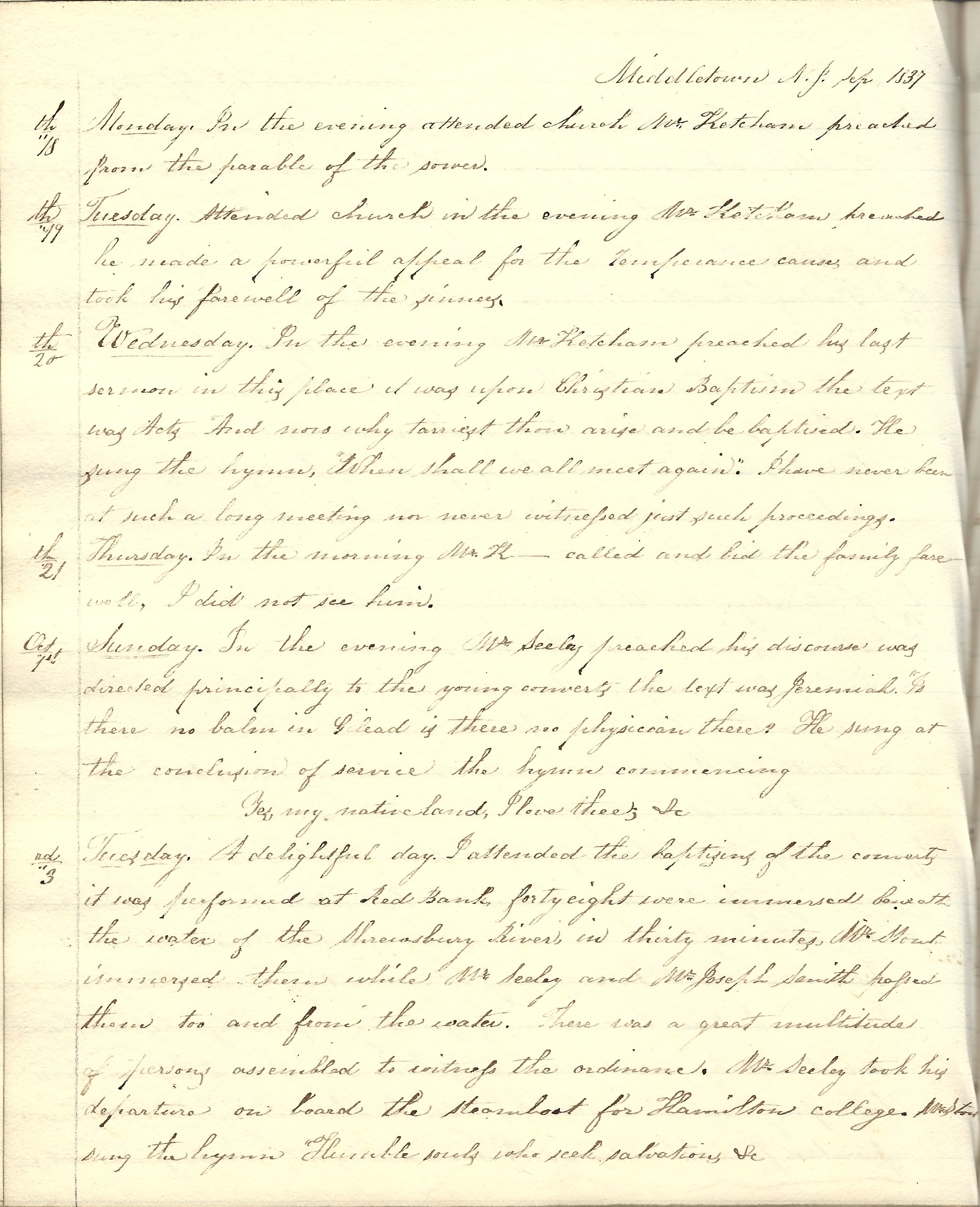 Tuesday, 3rd. A delightful day. I attended the baptisms of the converts. It was performed at Red Bank. Forty-eight were immersed beneath the water of the Shrewsbury River in thirty minutes. Mr. Stout immersed them while Mr. Seeley and Mr. Joseph Smith passed them to and from the water. There was a great multitude of persons assembled to witness the ordinance. Mr. Seeley took his departure on board the steamboat for Hamilton College. Mr. Stout sung the hymn, “Humble souls who seek salvation, &c.”