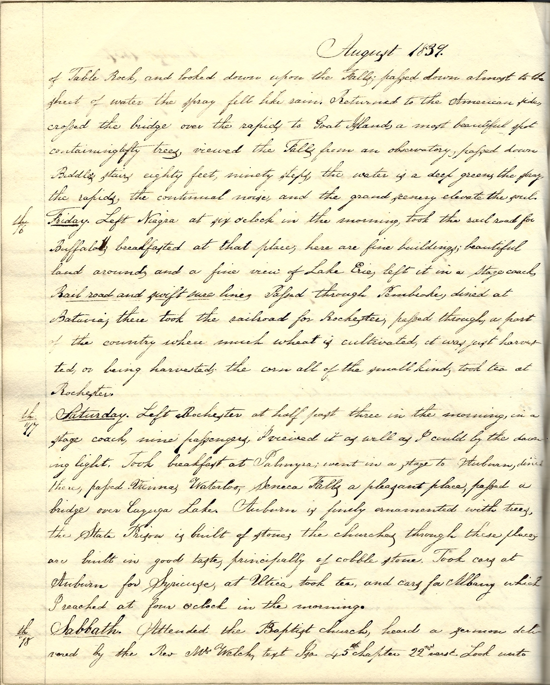 Saturday 17th. Left Rochester at half past three in the morning in a stage coach, nine passengers. I viewed it as well as I could by the dawning light. Took breakfast at Palmyra. Went in a stage to Auburn. Dined there. Passed Vienna, Waterloo, Seneca Falls—a pleasant place. Passed a bridge over Cayuga Lake. Auburn is finely ornamented with trees. The State Prison is built of stone. The churches through these places are built in good taste, principally of cobble stone. Took cars at Auburn for Syracuse. At Utica took tea, and cars for Albany which I reached at four o’clock in the morning.