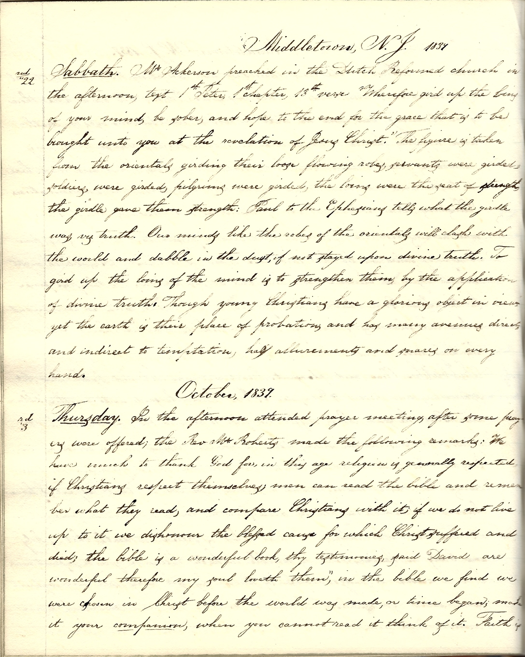 Sabbath [September] 22, 1839. Mr. Ackerson preached in the Dutch Reformed Church in the afternoon, text 1st Peter, 1st Chapter, 13th verse, “Wherefore gird up the loins of your mind, be sober, and hope to the end for the grace that is to be brought unto you at the revelation of Jesus Christ.” The figure is taken from the orientals, girding their loose flowing robes, servants were girded, soldiers were girded, pilgrims were girded, the loins were the seat of strength, the girdle gave them strength. Paul to the Ephesians tells what the girdle was, viz—truth. Our minds like the robes of the orientals will clash with the world and dabble in the dust, if not stayed upon divine truth. To gird up the loins of the mind is to strengthen them, by the application of divine truth. Though young Christians have a glorious object in view, yet the earth is their place of probation, and has many avenues direct and indirect to temptation, half allurements, and mares [?] on every hand.