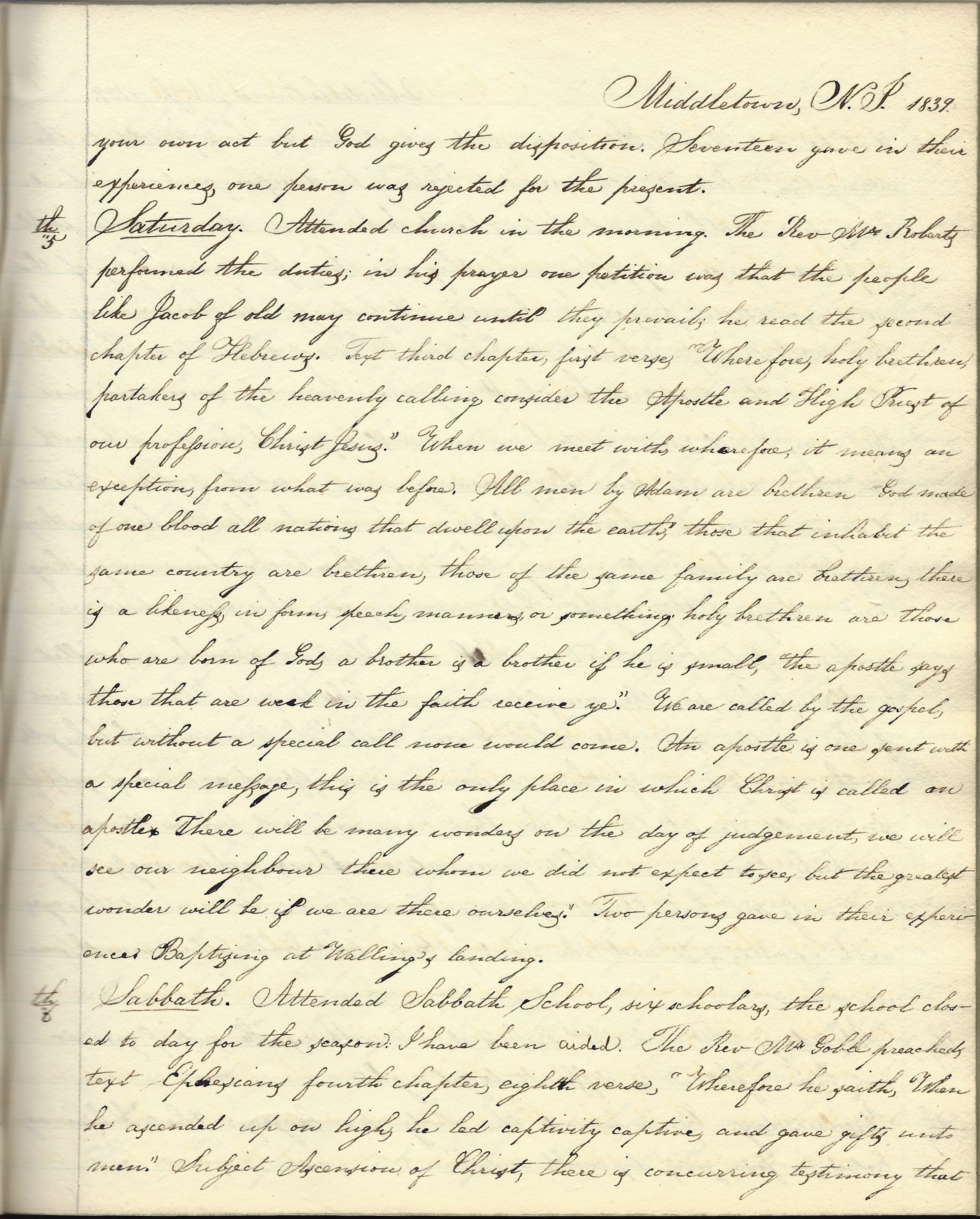 Saturday, October 5, 1839. Attended church in the morning. The Rev. Mr. Roberts performed the duties. In his prayer, one petition was that the people like Jacob of old may continue until they prevail. He read the 2nd Chapter of Hebrews…There will be many wonders on the day of judgement. We will see our neighbor there whom we did not expect to see, but the greatest wonder will be if we are there ourselves. Two persons gave in their experiences. Baptizing at Walling’s Landing.