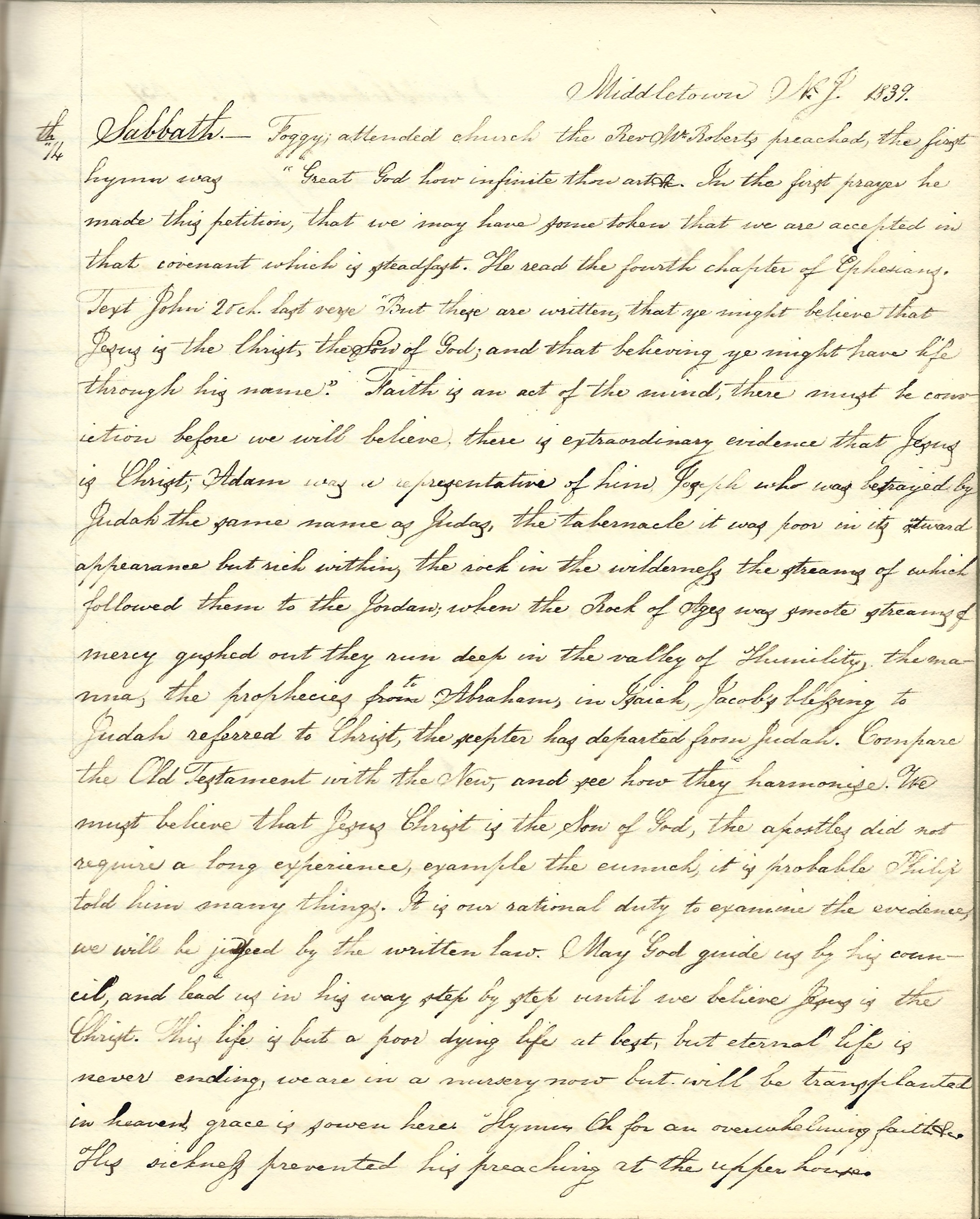 Middletown, New Jersey, Sabbath, October 14, 1839. Foggy. Attended church. The Rev. Mr. Roberts preached. The first hymn was, “Great God, how infinite thou art.”….