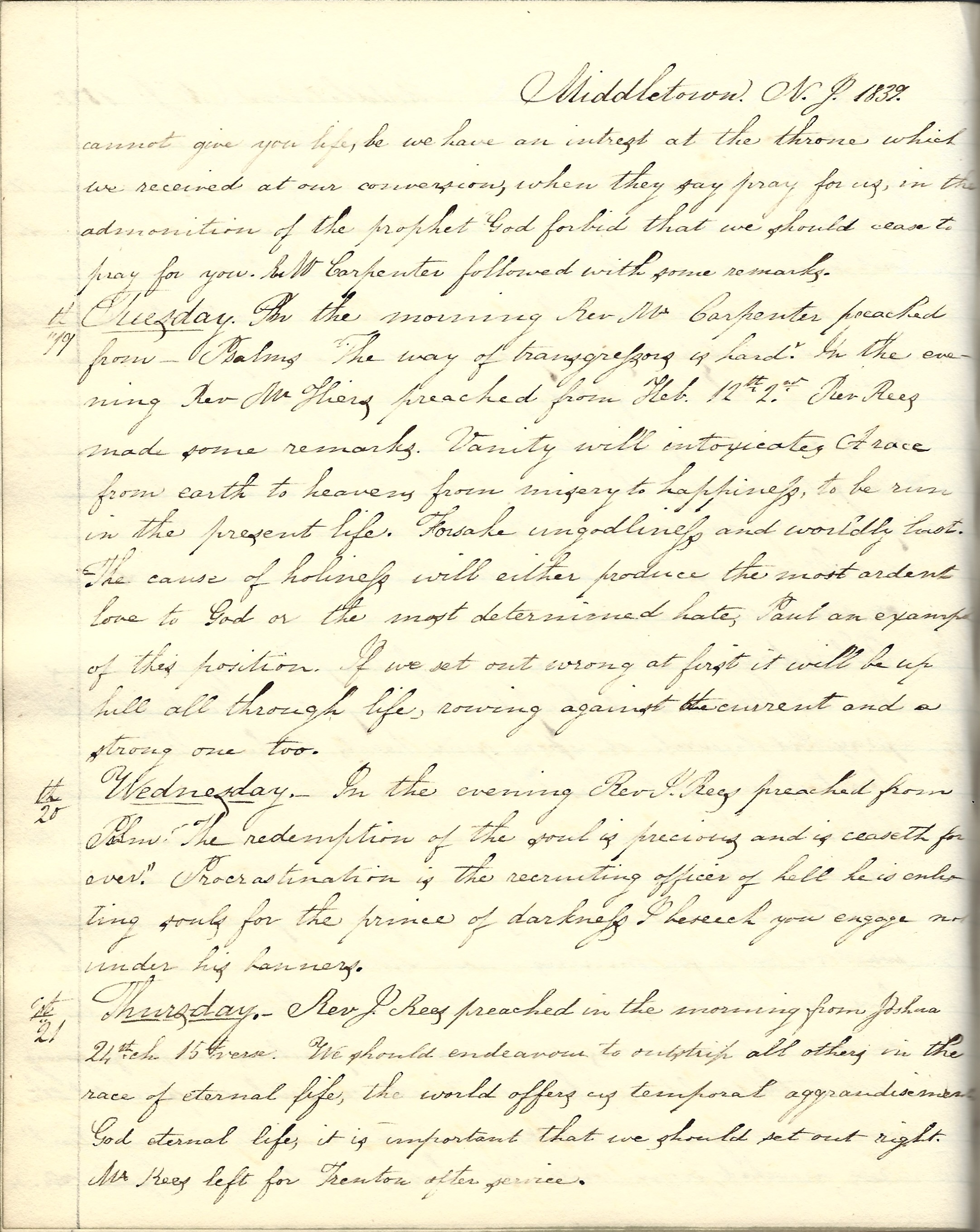 Tuesday 19th [November]. In the morning Rev. Mr. Carpenter preached from Psalms. “The way of transgressors is hard.” In the evening Rec. Mr. Hiers preached from Hebrews 12th, 2nd. Rev. Rees made some remarks. Vanity will intoxicate a race from earth to heavens, from misery to happiness to be run in the present life. Forsake ungodliness and worldly lust. The cause of holiness will either produce the most ardent love to God or the most determined hate. Paul an example of this position. If we set out wrong at first, it will be up hill all through life, rowing against the current and a strong one too.