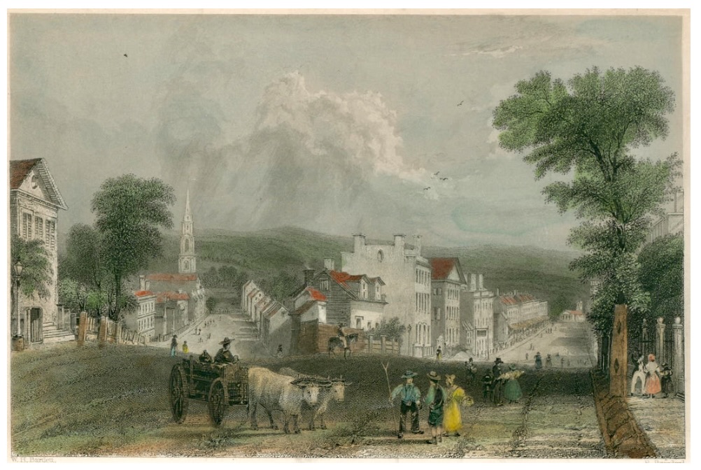 Just above Albany the country is infertile, partly covered with shrub pines. It is called Little Arabia. Changed cars at Schenectady. The college buildings appeared pleasantly situated on a ridge. Passed along the valley of the Mohawk. The country rises beautifully above it. Passed Amsterdam, stopped at Fonda for water at St. Johnsville [and] at Rockville. At all these places are houses for refreshment. They are large, look neat. The scenery on approaching and leaving Rockville is most romantic. Dined at Utica. Left immediately. Passed Whitesboro [and] Rome. The country level. The woods look old. The trees are covered with moss. Look as if they were decaying standing. Most beautiful meadows. Passed near Oneida Castle. Saw some Indians at an Inn. Halted to have the engine repaired. Arrived at Syracuse at ten o’clock at night. Viewed the place in the morning. It is beautifully situated. Wide streets. The Erie Canal passes through it and here unites with the Oswego Canal.