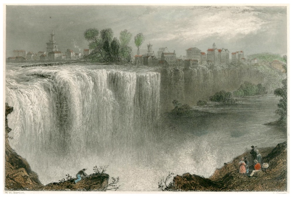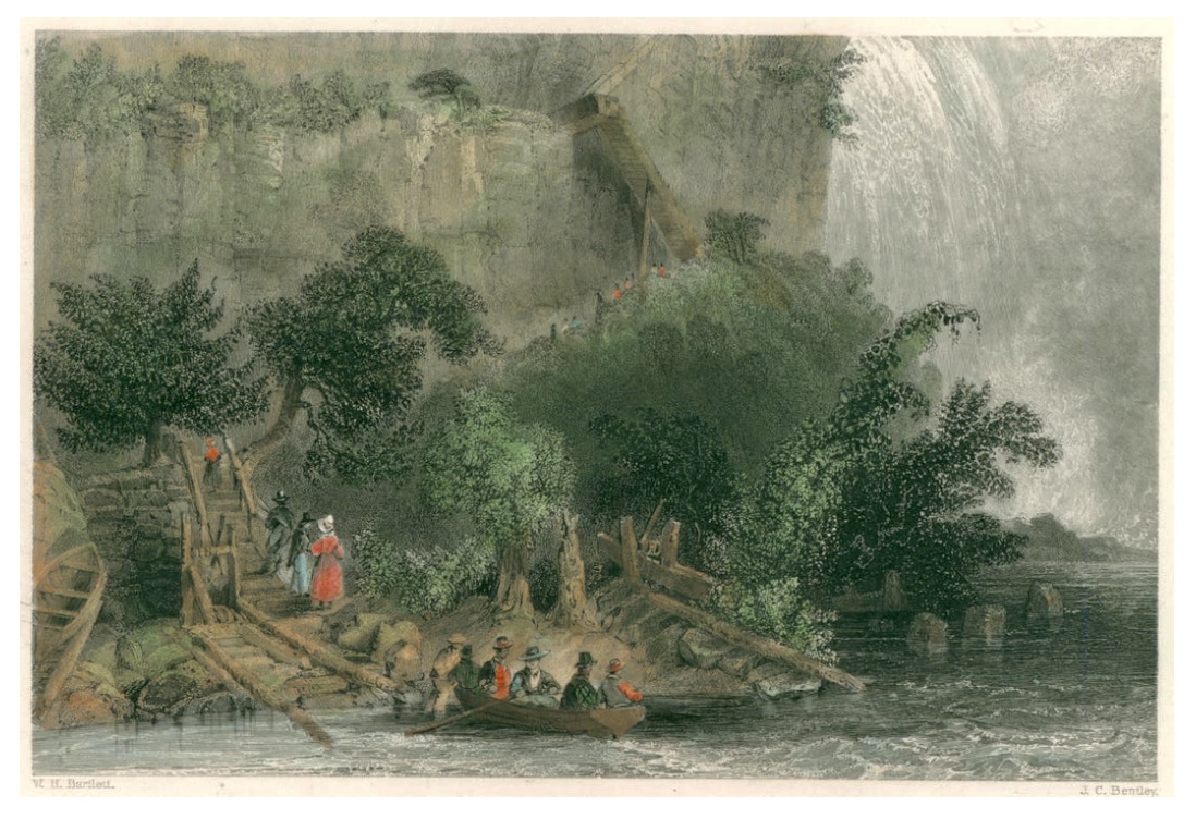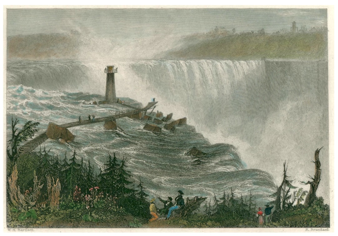 Returned to the American side, crossed the bridge over the rapids to Goat Island—a most beautiful spot containing lofty trees. Viewed the Falls from an observatory, passed down Biddle stair eighty feet, ninety steps. The water is a deep green. The spray, the rapids, the continual noise, and the grand scenery elevate the soul.