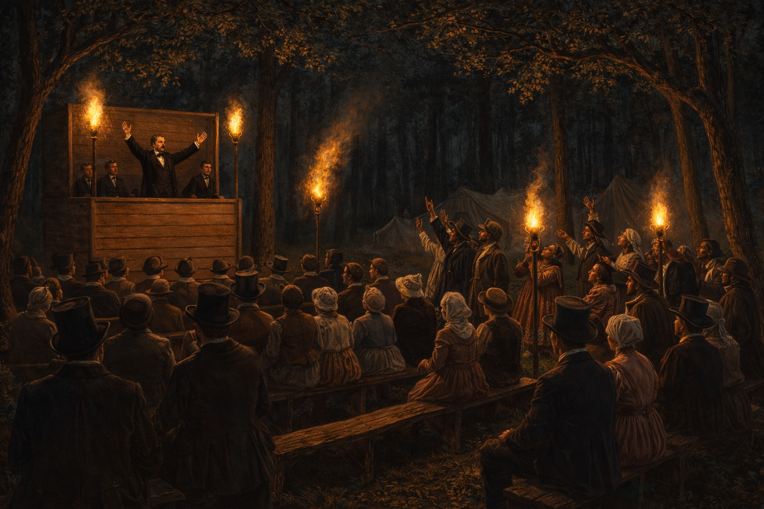 Wednesday, August 4, 1841. Inclination and invitation led me to camp meeting in the afternoon. At a distance from the camp, persons with wagons were supplying persons with cake and beer. The encampment consisted of 25 tents. In the evening it is lit up with pine knots and candles. Four posts are put in the ground, the top covered with boards; the boards with earth. The pine knots are burnt upon it. People from the neighboring towns were assembled; in the pulpit were nine ministers. A person preached much inclined to smile. The text was Luke, 15th Chapter from the 3rd to the 7th verse—a parable beautifully illustrative of Christ’s efforts to save publicans and sinners.