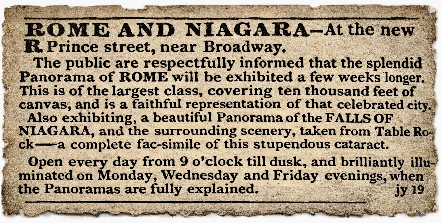 Friday 28th. Called to see an old schoolmate and heard from many of the girls. Some are at the South, some in the western part of New York, and some dead. It enlivened me to see them. I feel my ambition roused. A boarder has been proved to be a rascal, left. He had an under look out of his eyes and was always telling how rich he was and to crown all, left without paying his bill. In the evening visited the Panorama of Rome. It seemed like classic ground and every object stands prominent in memory.