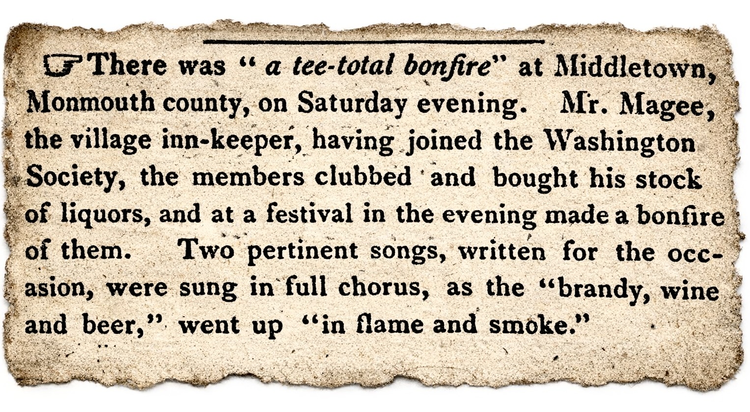 Saturday [March] 19th. The rum of Mr. John Magee was burnt in the street. There is to be a temperance house kept.