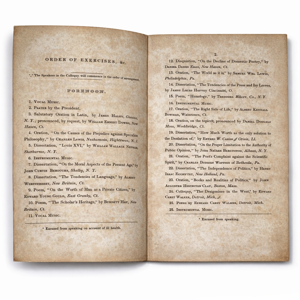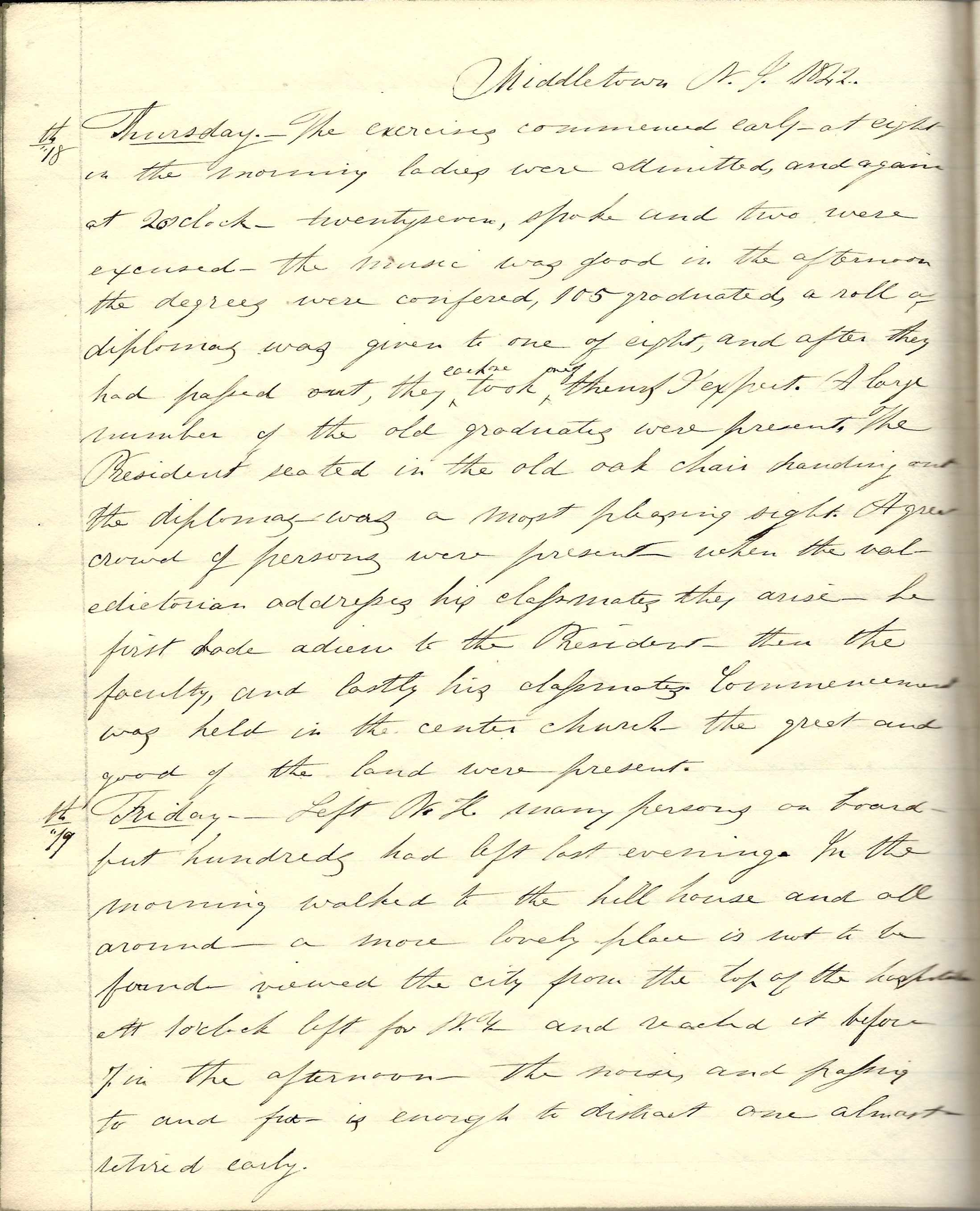 Thursday 18th. The exercises commenced early. At eight in the morning Ladies were admitted and again at 2 o’clock. Twenty-seven spoke and two were excused. The music was good. In the afternoon the degrees were conferred. 105 graduated. A roll of diplomas was given to one of eight and after they had passed out, they each one took one of them. I expect a large number of the old graduates were present. The President seated in the old oak chair handing out the displomas was a most pleasing sight. A great crowd of persons were present when the valedictorian addresses his classmates they arise. He first bade adieu to the President, then the faculty, and lastly his classmates. Commencement was held in the center church [chapel]. The great and good of the land were present.