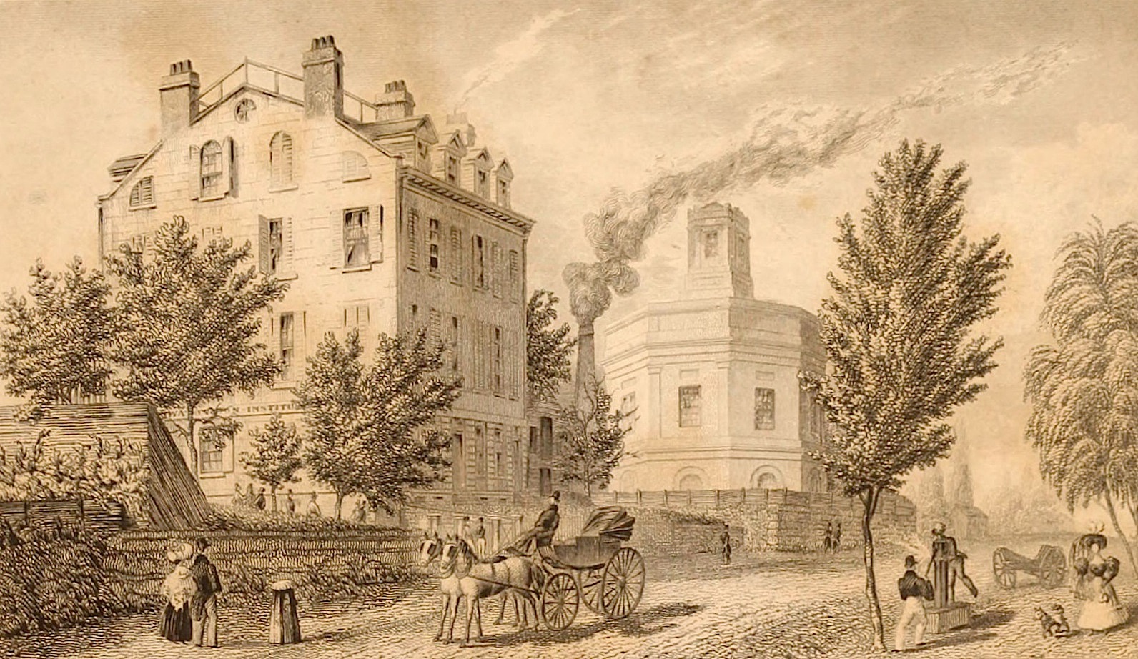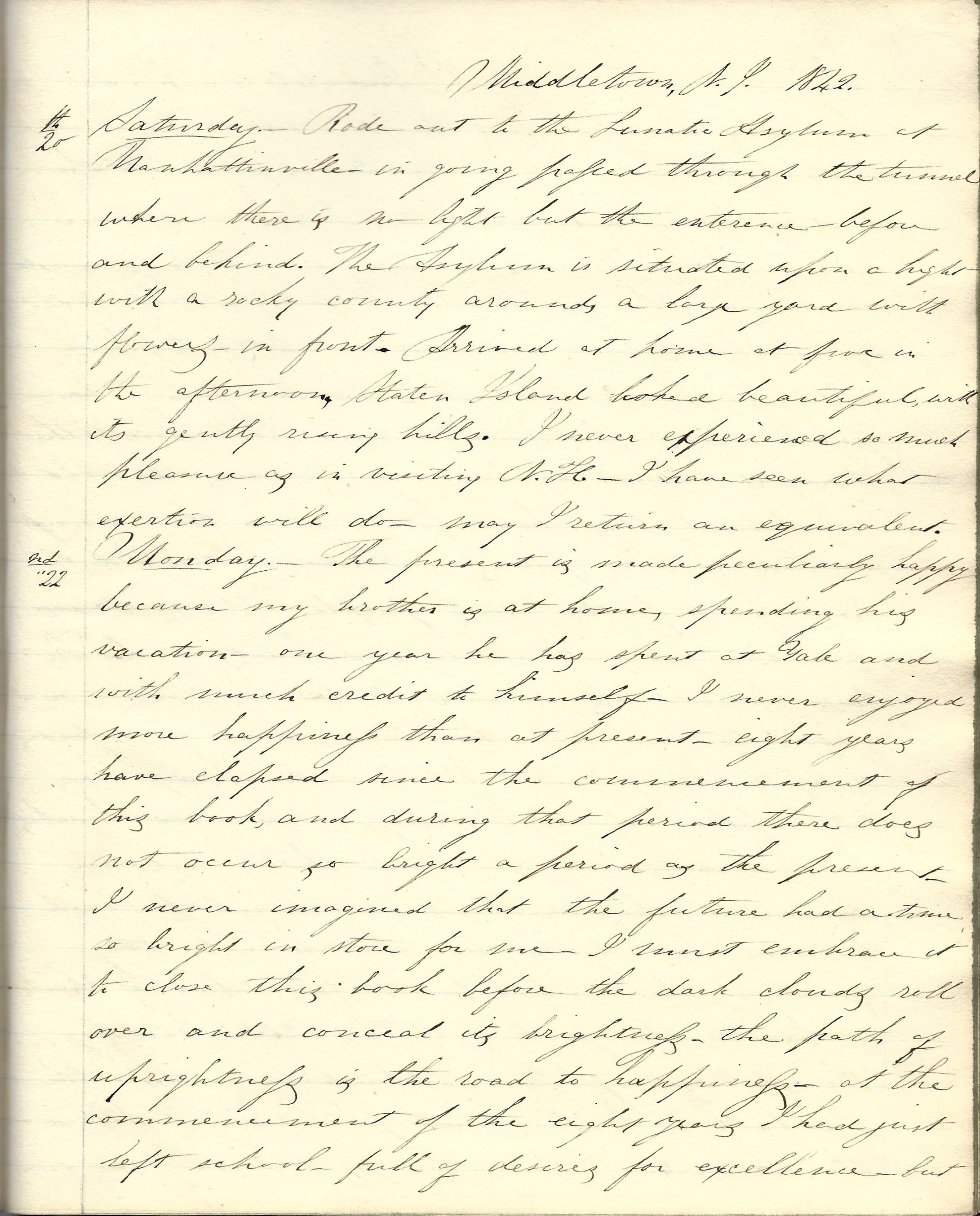 Saturday 20th. Rode out to the Lunatic Asylum at Manhattanville. In going, passed through the tunnel where there is a light but the entrance before and behind. The Asylum is situated upon a hight with a rocky county around a large yard with flowers in front. Arrived at home at five in the afternoon. Staten Island looked beautiful with its gently rising hills. I never experienced so much pleasure in visiting New Haven. I have seen what exertion will do. May I return an equivalent.