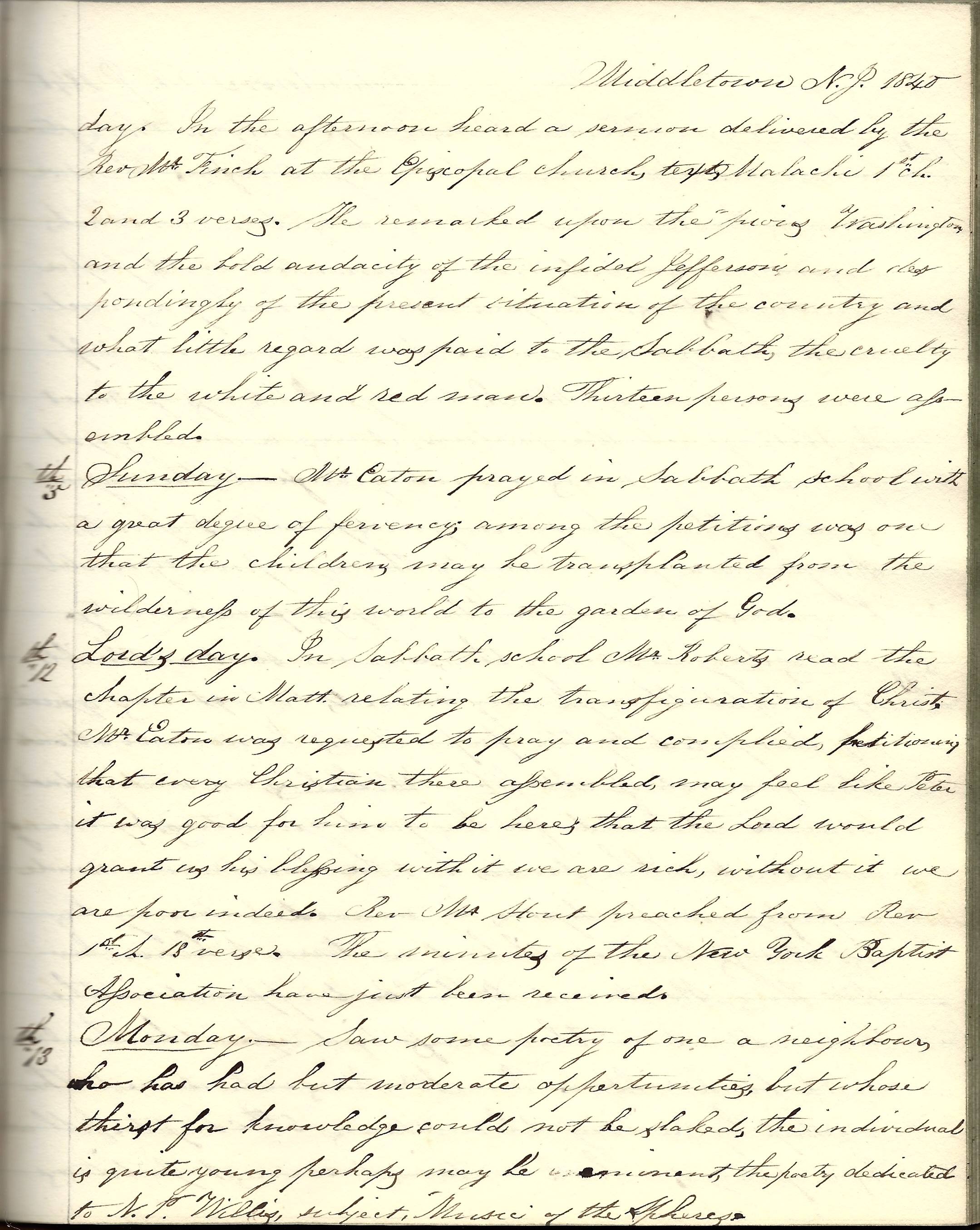 Lord’s Day 12th. In Sabbath school, Mr. Roberts read the chapter in Matt. relating the transfiguration of Christ. Mr. Eaton was requested to pray and complied, petitioning that every Christian there assembled may feel like Peter. It was good for him to be here—that the Lord would grant us his blessing. With it we are rich; without it we are poor indeed. Re. Mr. Stout preached from Revelations 1st Chapter, 18th verse. The minutes of the New York Baptist Association have just been received.