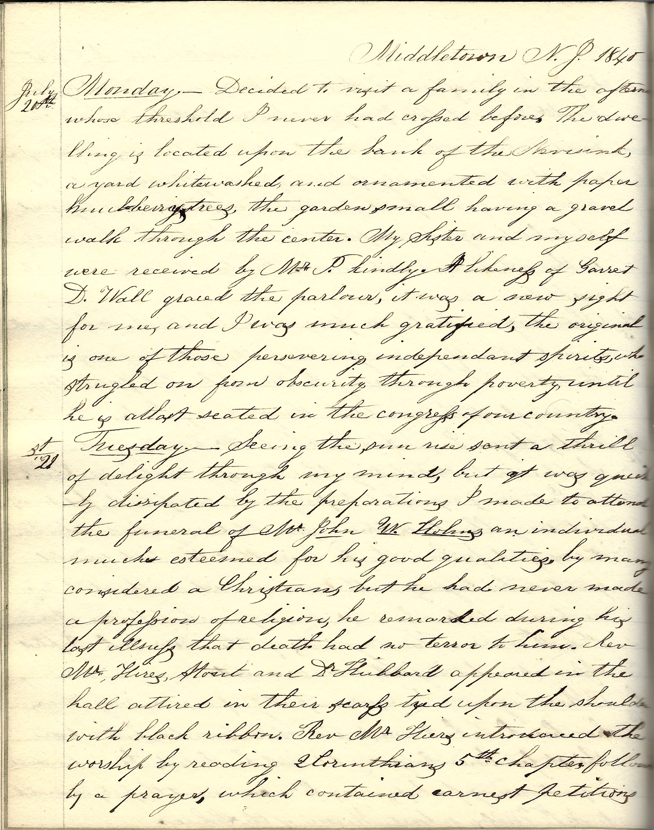 Monday 20th. Decided to visit a family in the afternoon whose threshold I never had crossed before. The dwelling is located upon the bank of the Navesink [river], a yard whitewashed, and ornamented with paper huckleberry trees; the garden small, having a gravel walk through the center. My sister and myself were received by Mr. Phindly. A likeness of Garret D[orset] Wall graced the parlor. It was a new sight for me and I was much gratified. The original is one of those persevering independent spirits who struggled on from obscurity through poverty until he is at last seated in the Congress of our country.