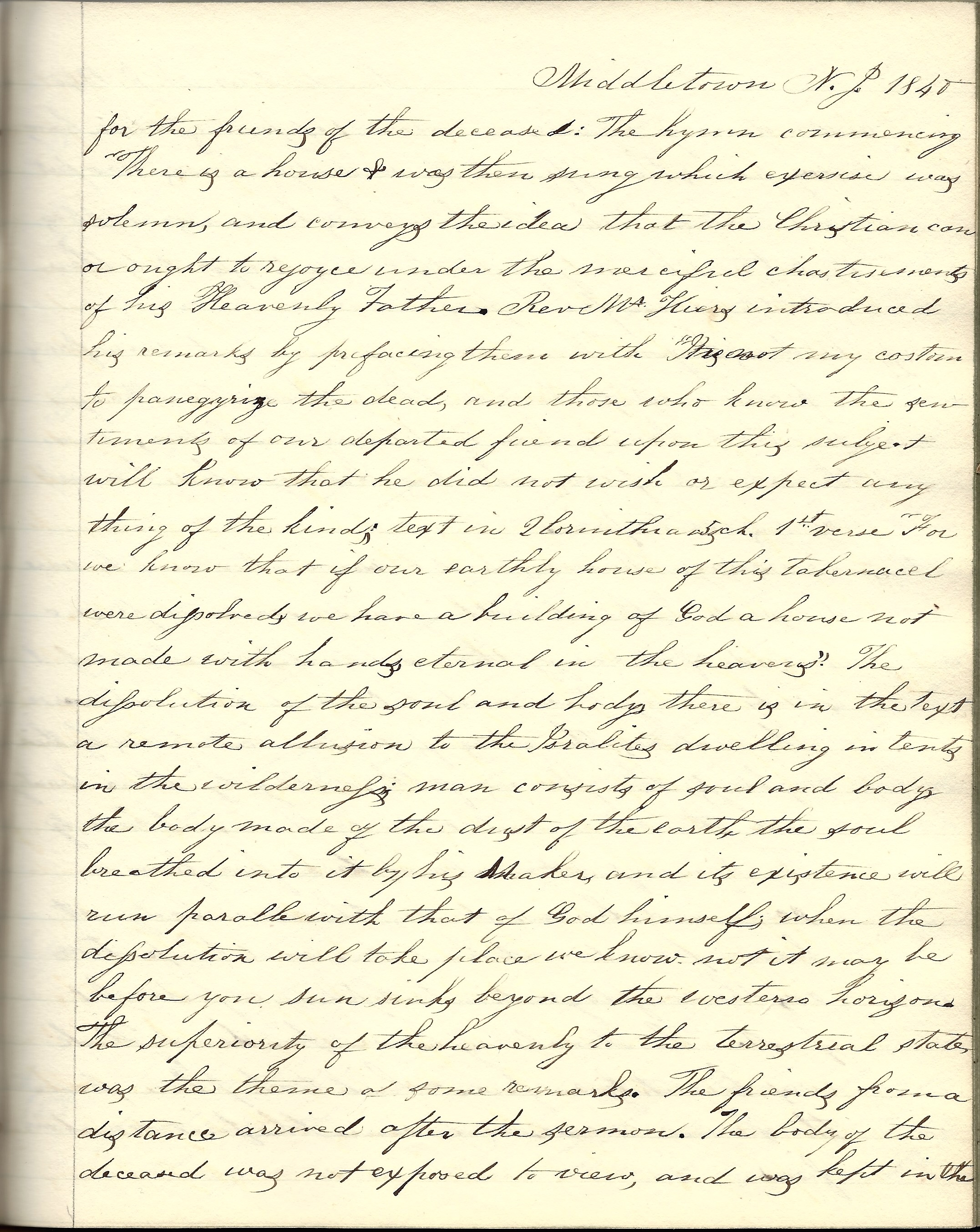 Sabbath 26th. Rev. Mr. Stout preached the funeral sermon of Mrs. Cornelia Dorset. Text 2nd Corinthians, 5th Chapter, 8th verse. Made some remarks upon the happiness of the heavenly state.