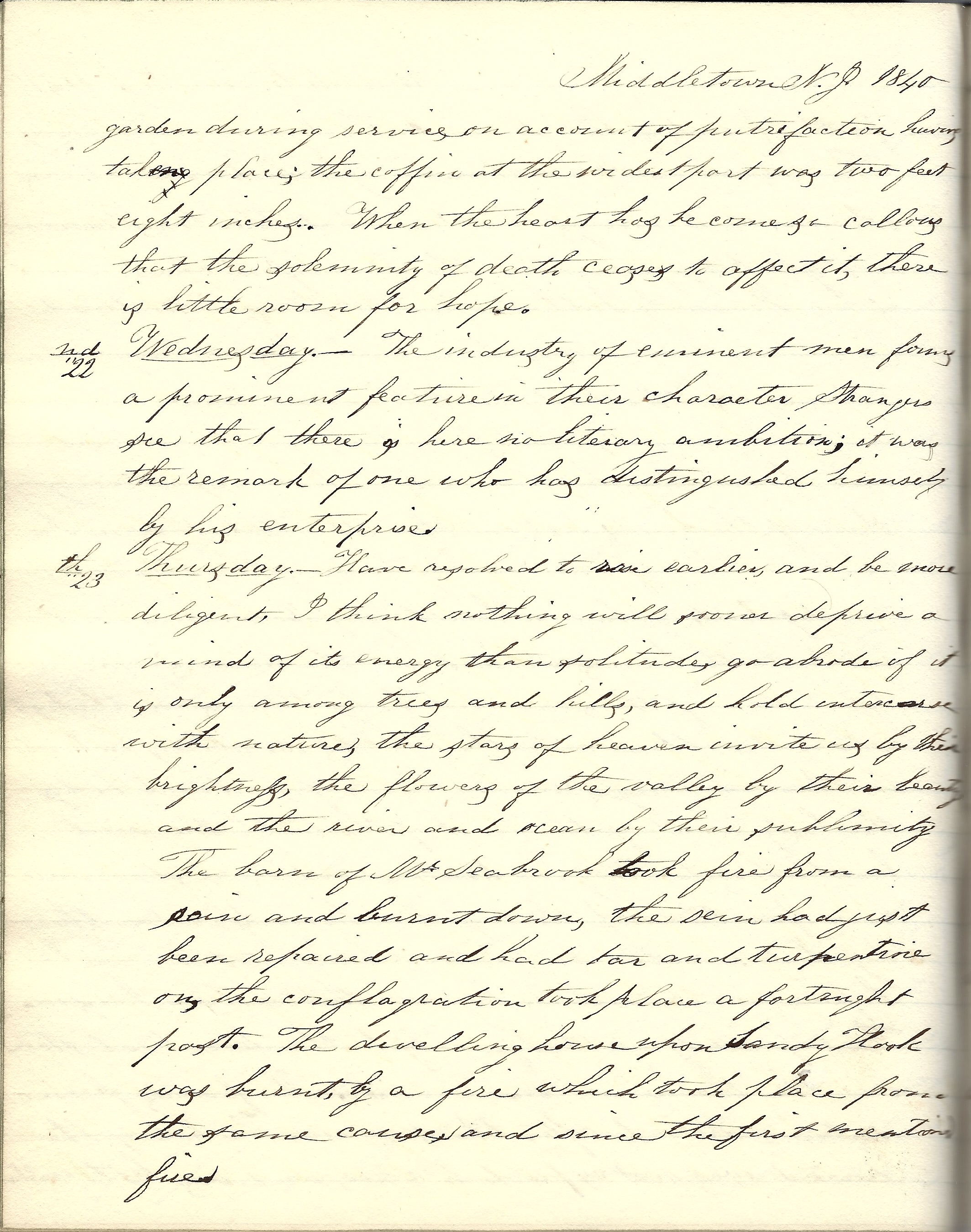 Thursday 23rd. Have resolved to rise earlier and be more diligent. I think nothing will sooner deprive a mind of its energy than solitude. Go abroad if it is only among the trees and hills and hold intercourse with nature. The stars of heaven invite us by their brightness, the flowers of the valley by their beauty, and the river and ocean by their sublimity.