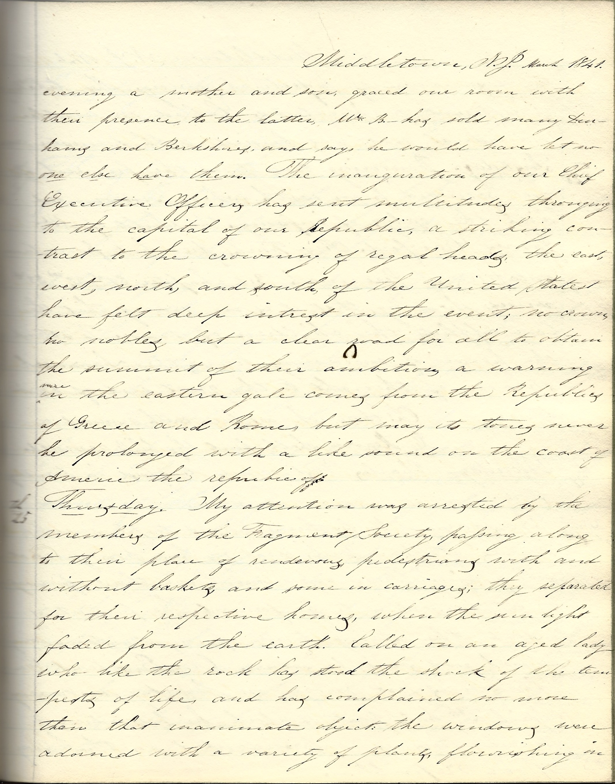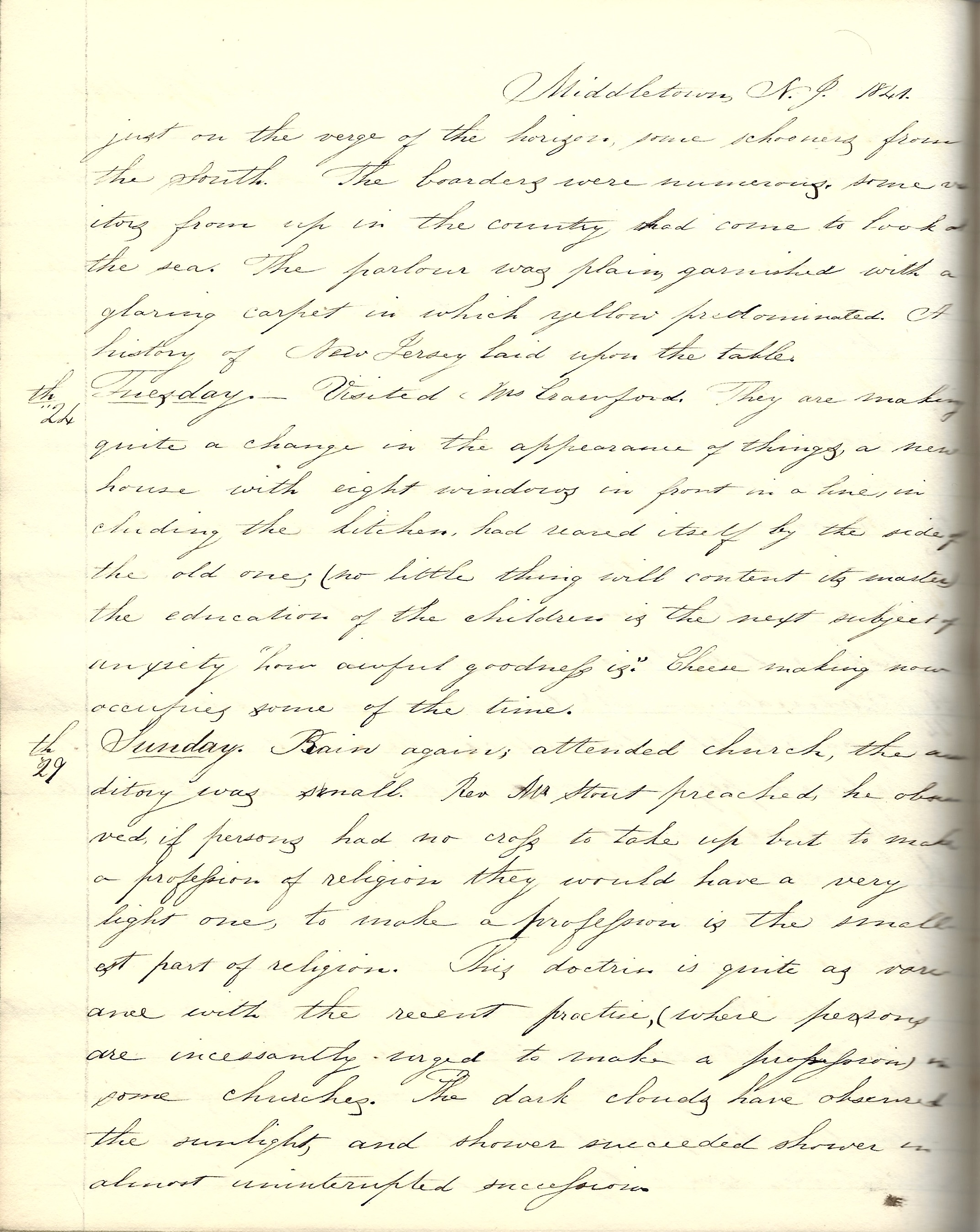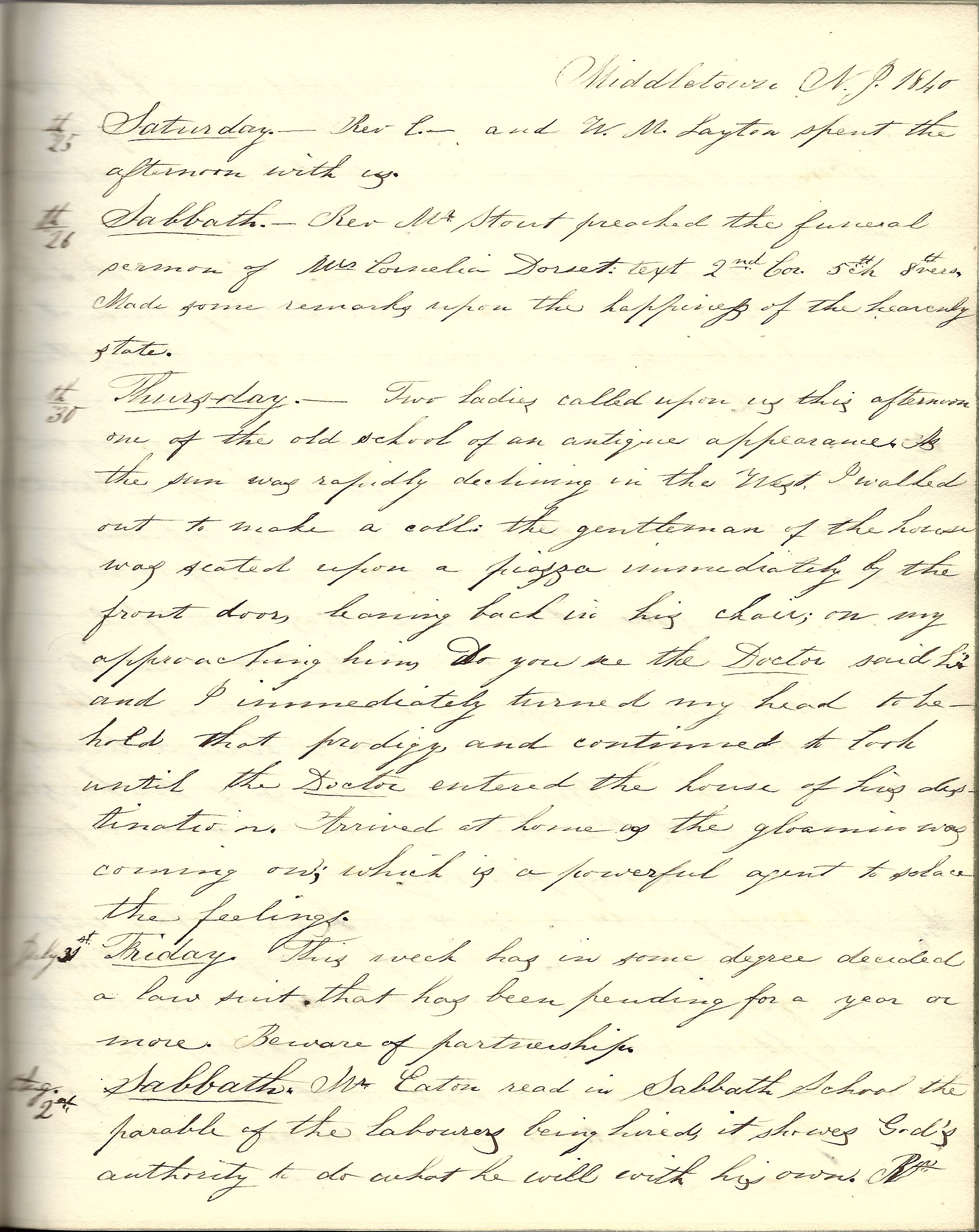 Middletown, New Jersey, Tuesday, March 31, 1840. In the afternoon had the pleasure of a visit from Mr. and Mrs. Stout.