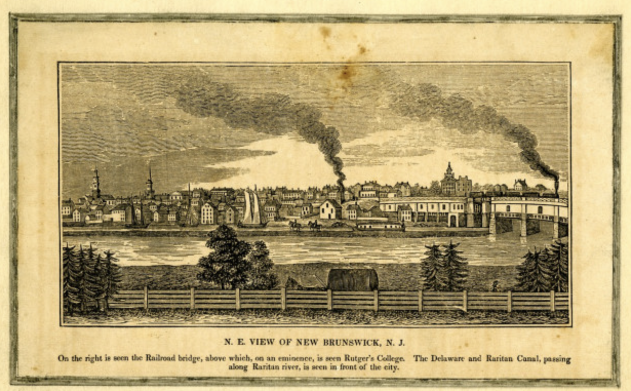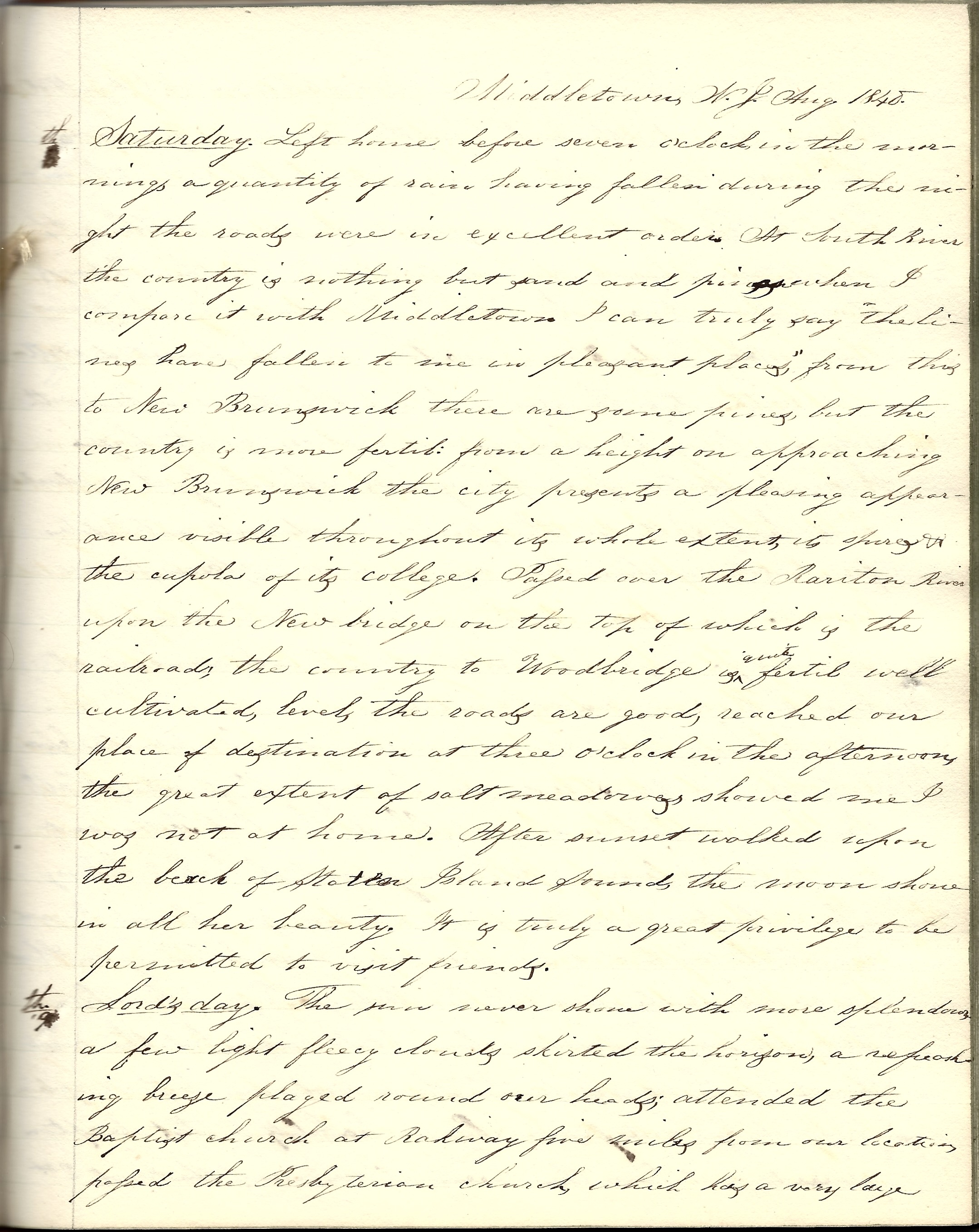 Saturday 8th. Left home before seven o’clock in the morning. A quantity of rain having fallen during the night, the roads were in excellent order. At South River the country is nothing but sand and pines when I compare it with Middletown. I can truly say “the lines have fallen to me in pleasant places.” From this to New Brunswick there are some pines but the country is more fertile. From a height in approaching New Brunswick, the city presents a pleasing appearance—visible throughout its whole extent, its spires & the cupola of its college. Passed over the Raritan River upon the new bridge on the top of which is the railroad.