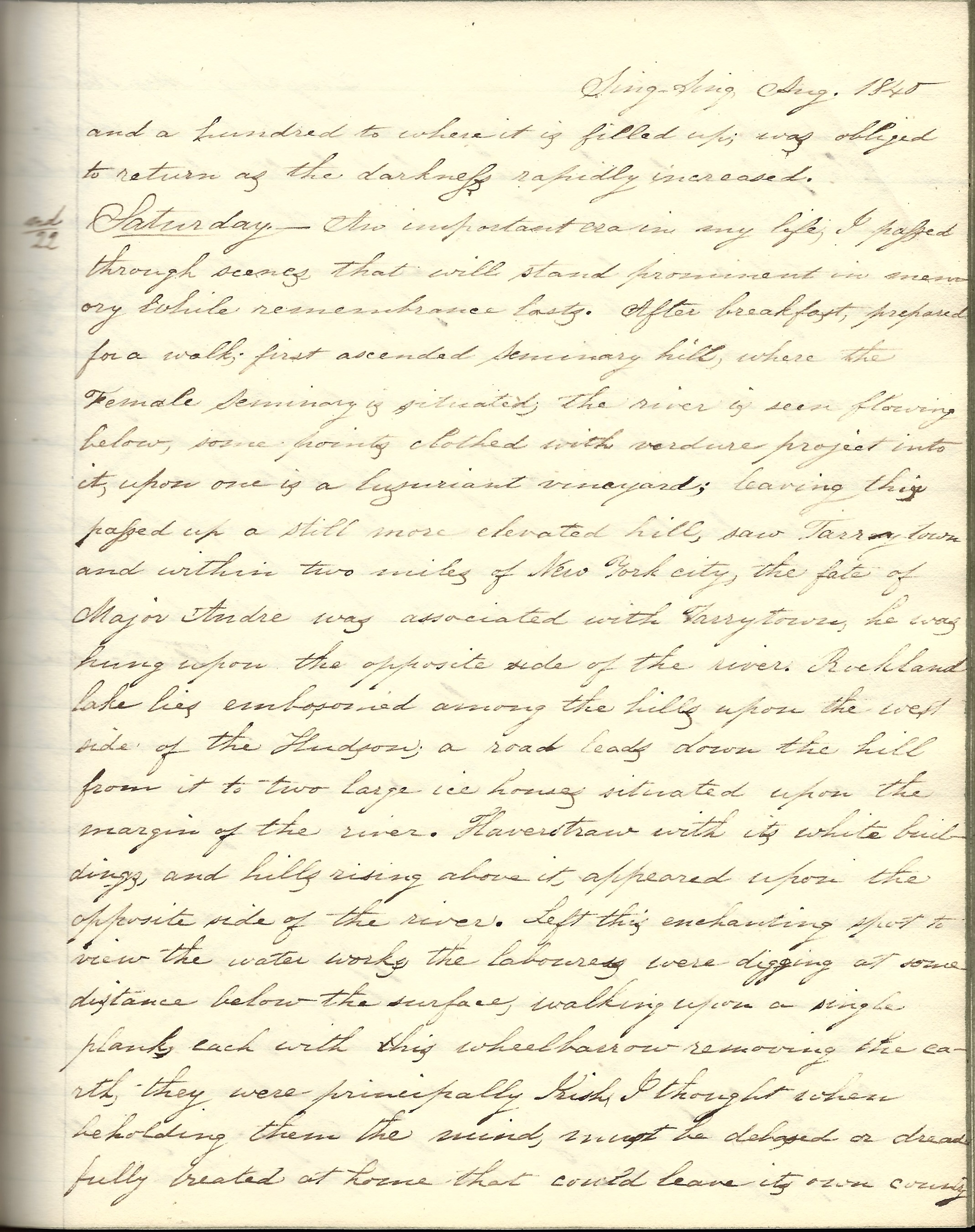 Saturday 22nd. An important era in my life, I passed through scenes that will stand prominent in memory while remembrance lasts. After breakfast, prepared for a walk. First ascended Seminary Hill where the [Mount Pleasant] Female Seminary is situated. The river is seen flowing below. Some points clothed with verdure project into it. Upon one is a luxuriant vineyard. Leaving this, passed up a still more elevated hill. Saw Tarrytown and within two miles of New York City, the fate of Major Andre was associated with Tarrytown. He was hung upon the opposite side of the river. Rockland Lake lies embosomed among the hills upon the west side of the Hudson. A road leads down the hill. From it two large ice houses situated upon the margin of the river. Haverstraw with its white buildings and hills rising above it appeared upon the opposite side of the river.