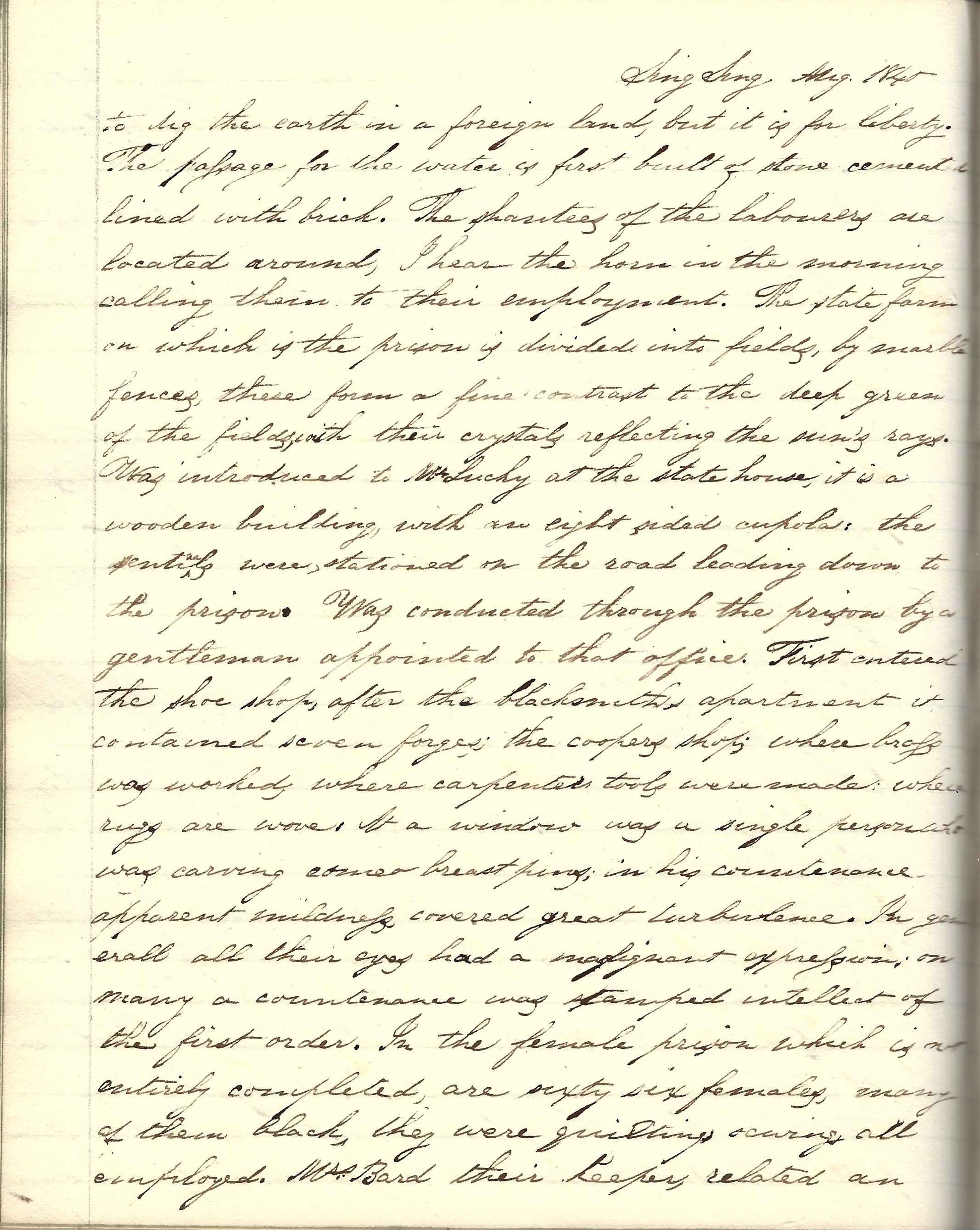 The state farm on which is the prison is divided into fields by small fences. These form a fine contrast to the deep green of the fields with their crystals reflecting the sun’s rays. Was introduced to Mr. [John] Luckey at the State House. It is a wooden building with an eight sided cupola. The sentinels were stationed on the road leading down to the prison. Was conducted through the prison by a gentleman appointed to that office. First entered the shoe shop, after [that] the blacksmith’s apartment—it contained seven forges; the cooper’s shop, where brass was worked, where carpenter’s tools were made, where rugs are wove. At a window was a single person who was carving cameo breast pins. In his countenance, apparent mildness covered great turbulence. In general, all their eyes had a malignant expression. On many a countenance was stamped intellect of the first order.