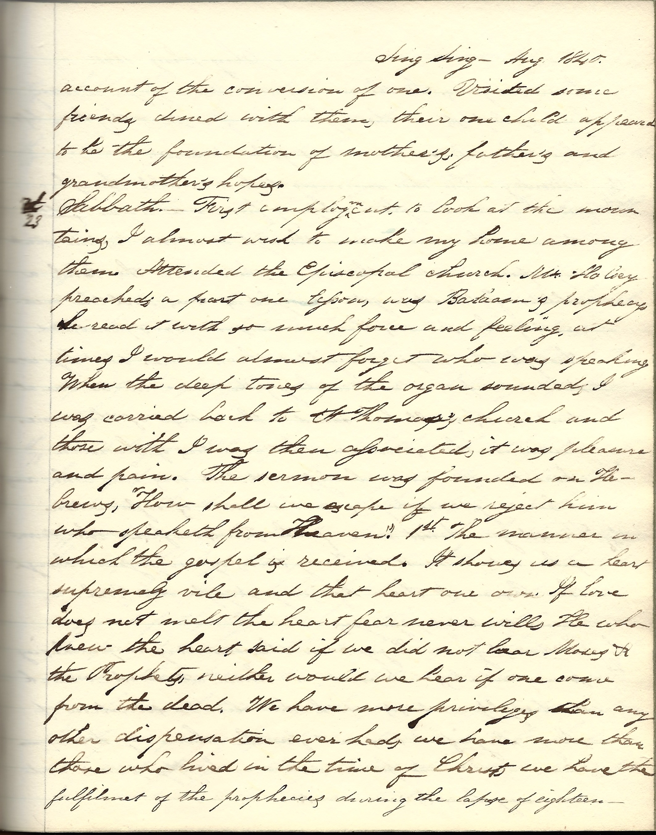 Sabbath, 23rd. First employment. to look at the mountains. I almost wish to make my home among them. Attended the Episcopal Church. Mr. [Charles Henry] Halsey preached…He read it with so much force and feeling at time I would almost forget who was speaking. When the deep tones of the organ sounded, I was carried back to Thomas’ church and those with [whom] I was then associated. It was pleasure and pain. The sermon was founded in Hebrews, “How shall we escape if we reject him who speaketh from Heaven?”…In the evening attended a prayer meeting held by Baptists in the upper room of a store. They have left their church on account of false doctrine.