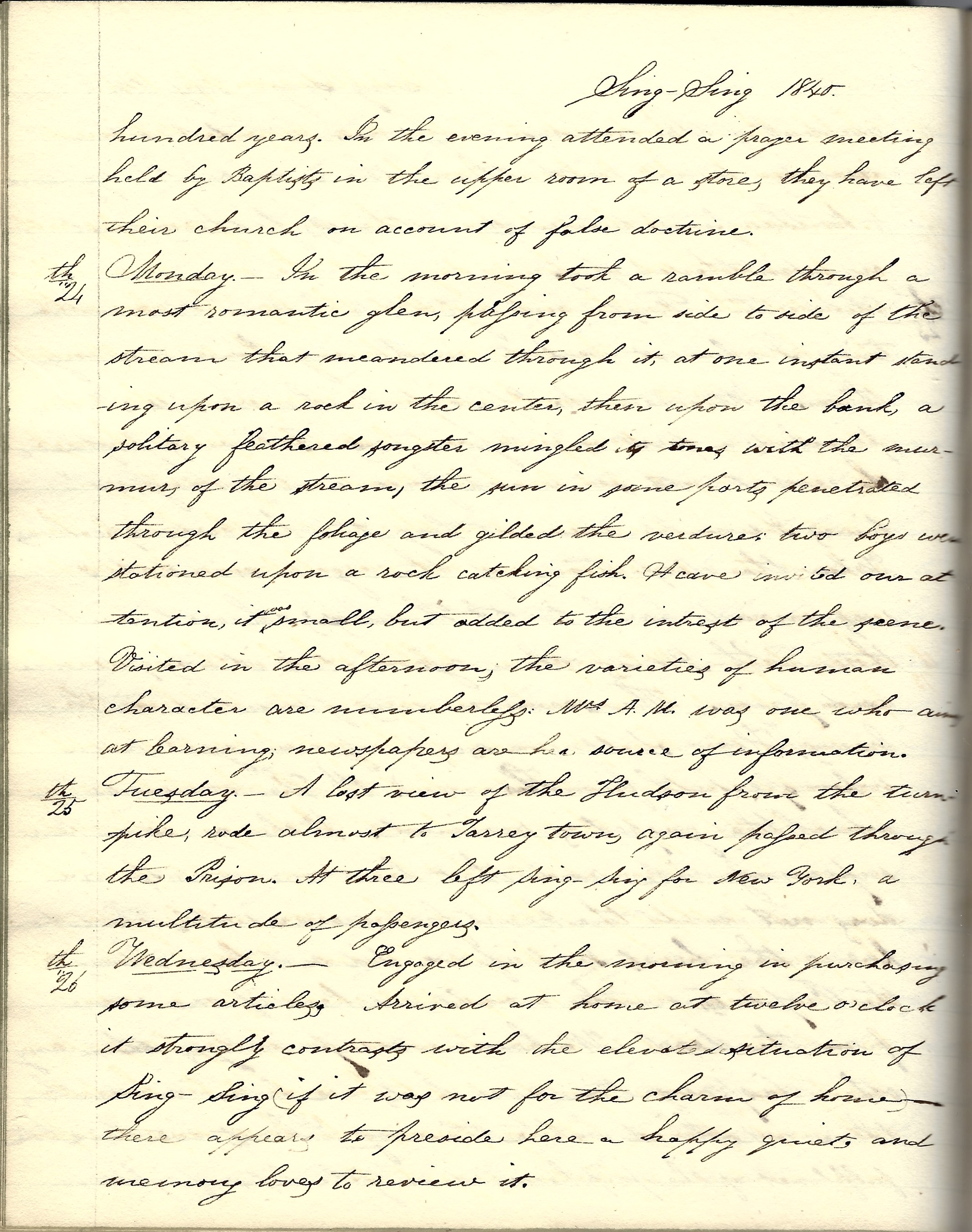 Wednesday 26th. Engaged in the morning purchasing some articles. Arrived at home at twelve o’clock. It strongly contrasts with the elevated situation of Sing-Sing (if it was not for the charm of home). There appears to preside here a happy quiet and memory loves to review it.