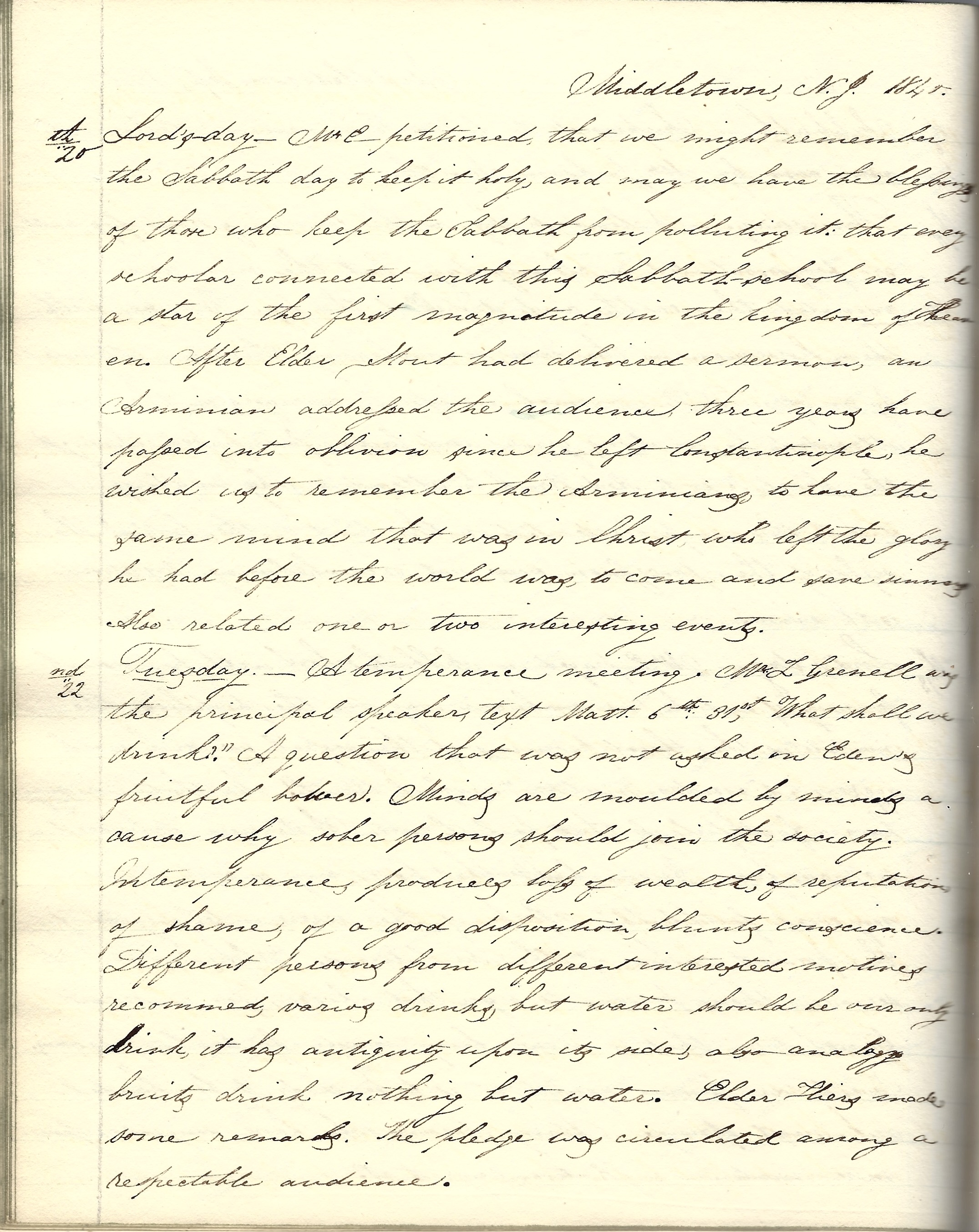 Tuesday 22nd. A Temperance Meeting. Mr. L. Grennell was the principal speaker. Text, Matthew 6th Chapter, 31st verse. “What shall we drink.” A question that was not asked in Eden’s fruitful bower. Minds are moulded by minds—a cause why sober persons should join the society. Intemperance produces loss of wealth, or reputation of shame, of a good disposition, blunts conscience. Different persons from different interested motives recommend various drinks but water should be our only drink. It has antiquity upon its side. Also analogy bruits drink nothing but water. Elder Hires made some remarks. The pledge [to abstain from drink] was circulated among a respectable audience.