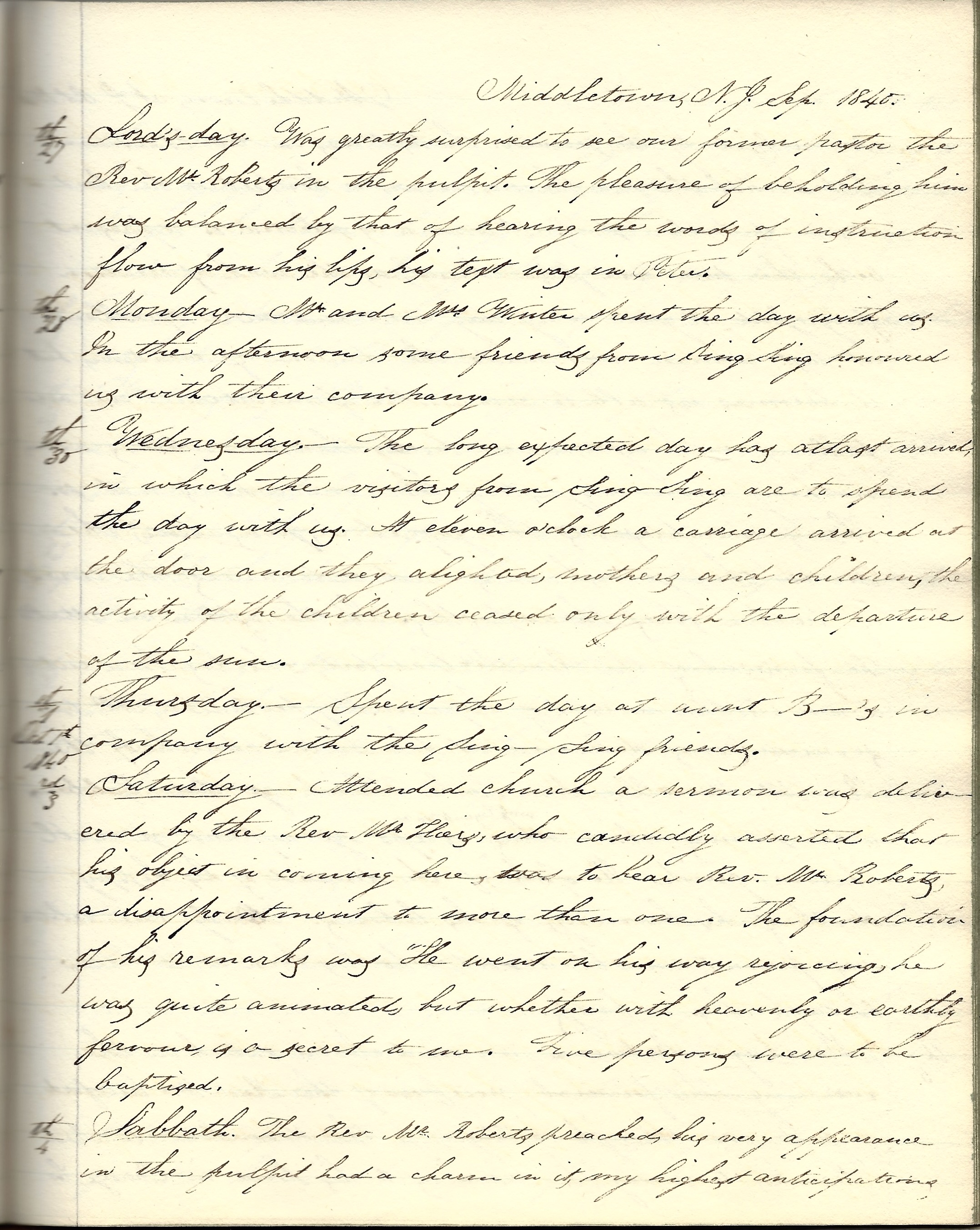 Lord’s Day, 27th. Was greatly surprised to see our former pastor, the Rev. Mr. Roberts in the pulpit. The pleasure of beholding him was balanced by that of hearing the words of instruction flow from his lips. His text was in Peter.