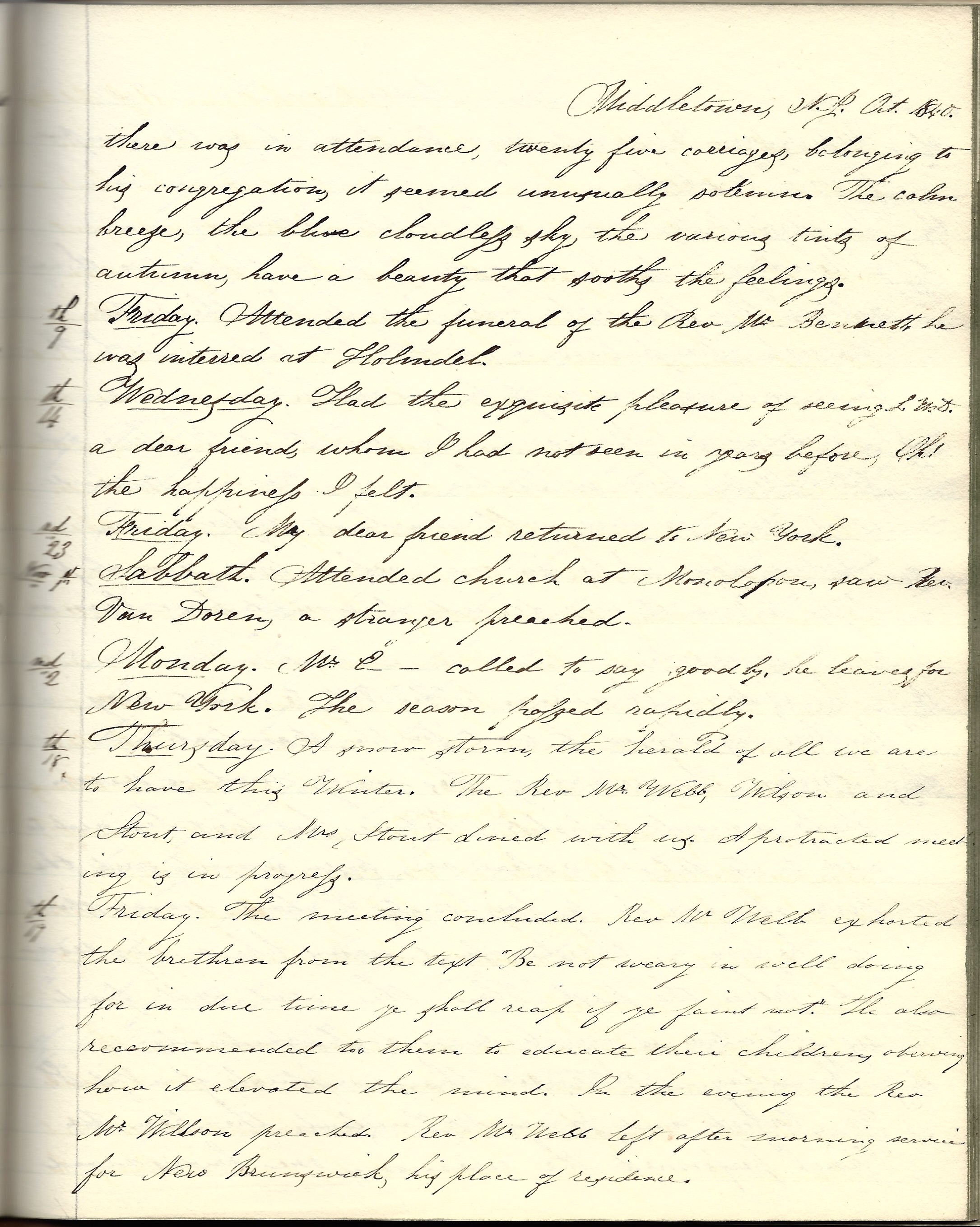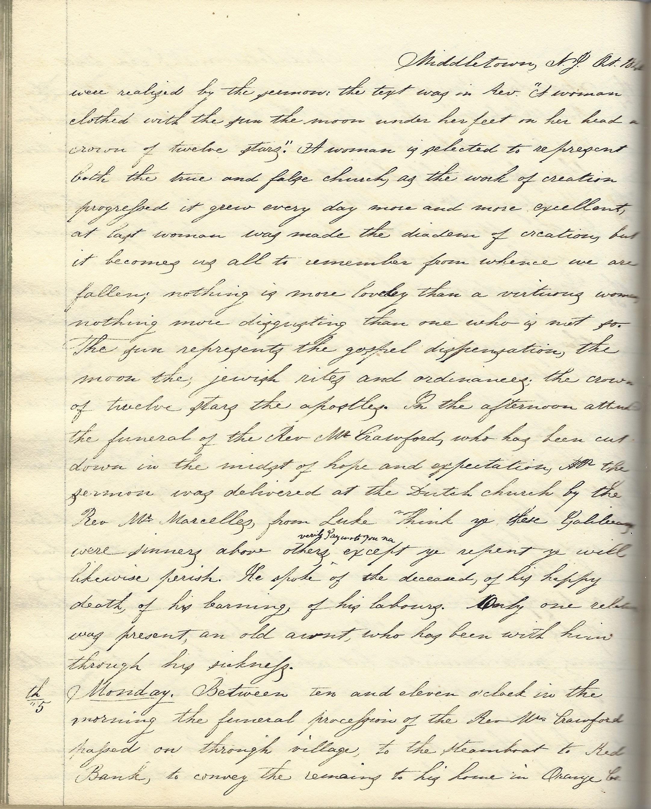 Monday, 5th. Between ten and eleven o’clock in the morning the funeral procession of the Rev. Mr. Crawford passed on through village to steamboat to Red Bank to convey the remains to his home in [Pine Brush] Orange county [New York]. There was in attendance twenty-five carriages belonging to his congregation. It seemed unusually solemn. The calm breeze, the blue cloudless sky, the various tents of autumn have a beauty that soothe the feelings.
