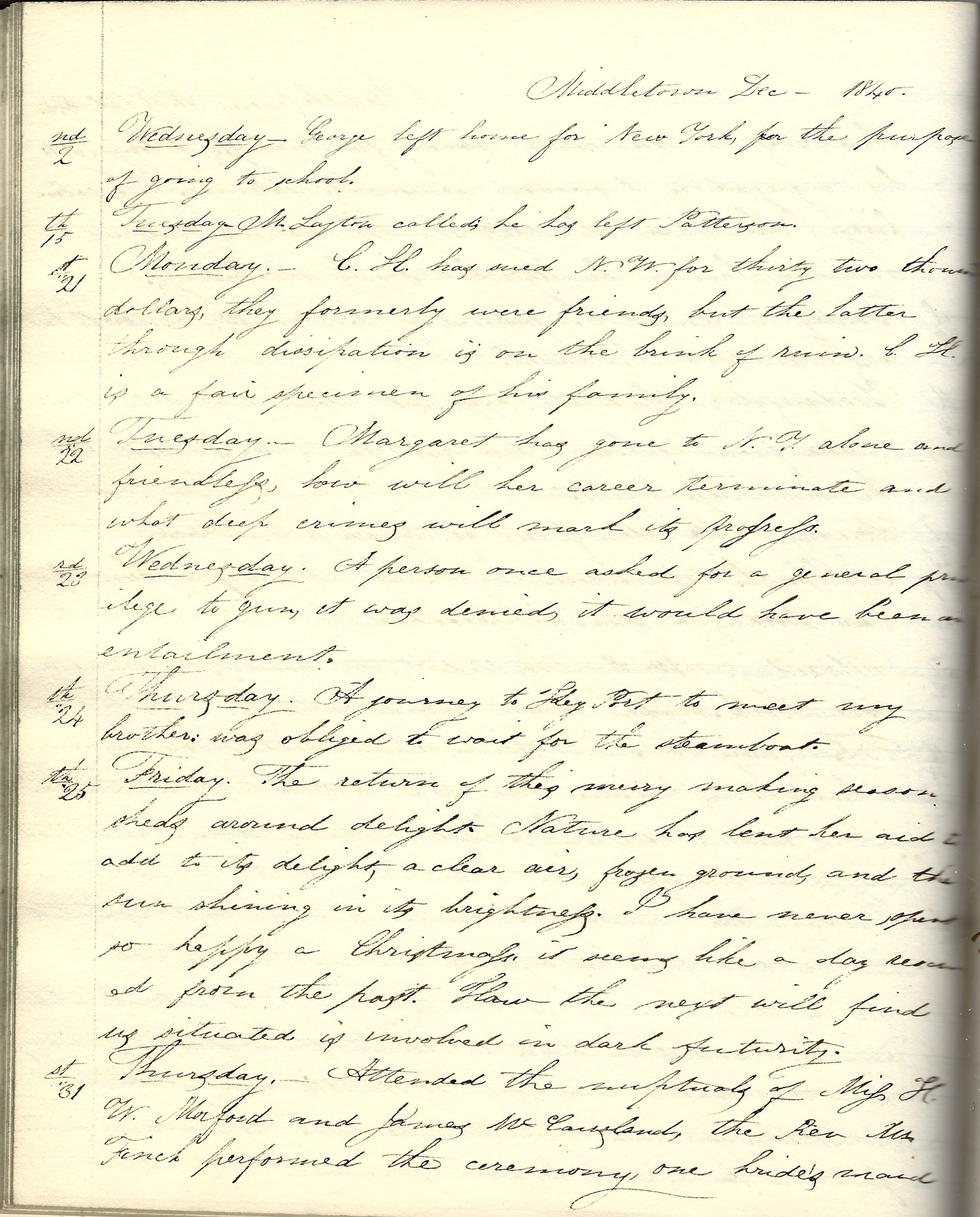 Wednesday, December 2, 1840. George left home for New York for the purpose of going to school.