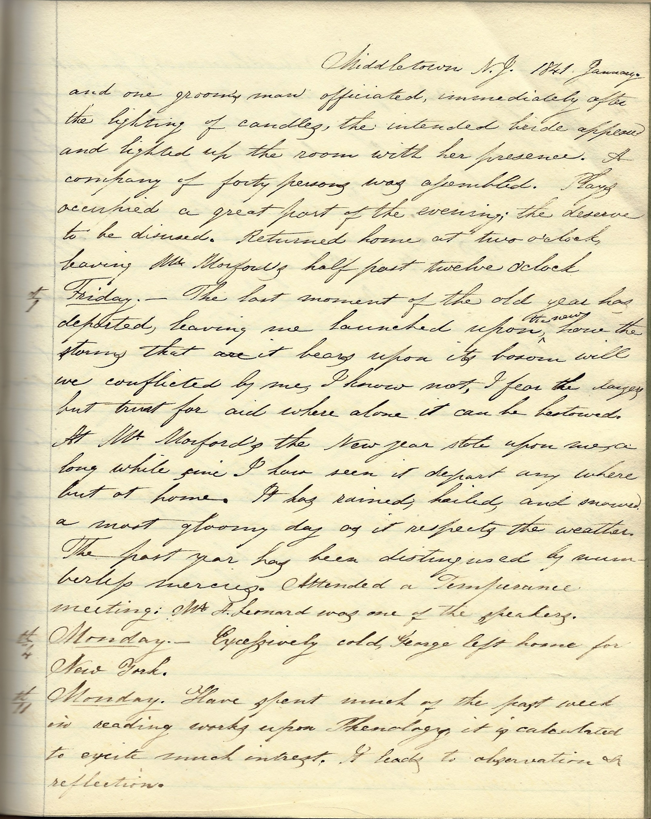 Friday, January 1, 1841. The last moment of the old year has departed, leaving me launched upon the new. How the storms that it bears upon its bosom will be conflicted by me, I know not. I fear the largess but trust for aid where alone it can be bestowed. At Mr. [Garrett] Morford’s, the New Year stole upon me—a long while since I have seen it depart anywhere but at home. It has rained, hailed, and snowed—a most gloomy day as it respects the weather. The past year has been distinguished by numberless mercies. Attended a Temperance Meeting. Mr. A. Leonard was one of the speakers.