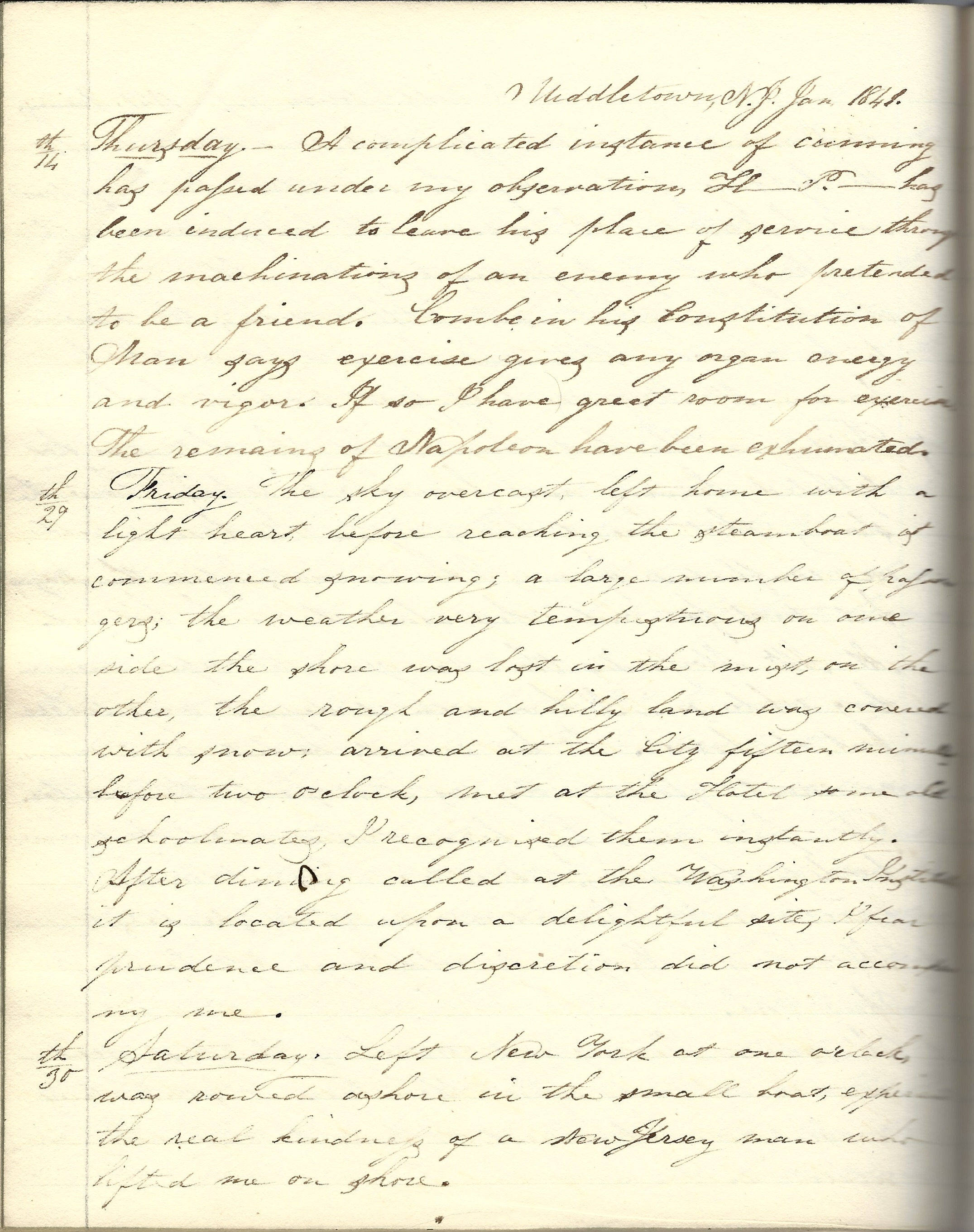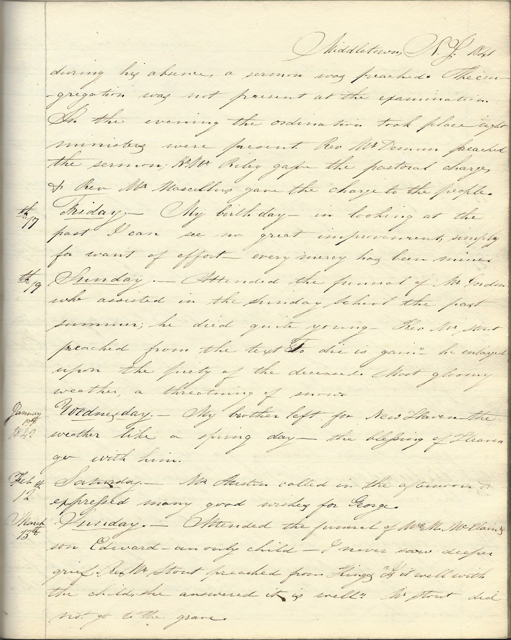 Middletown, New Jersey, Wednesday, January 19, 1842. My brother left for New Haven. The weather like a spring day. The blessing of Heaven go with him.