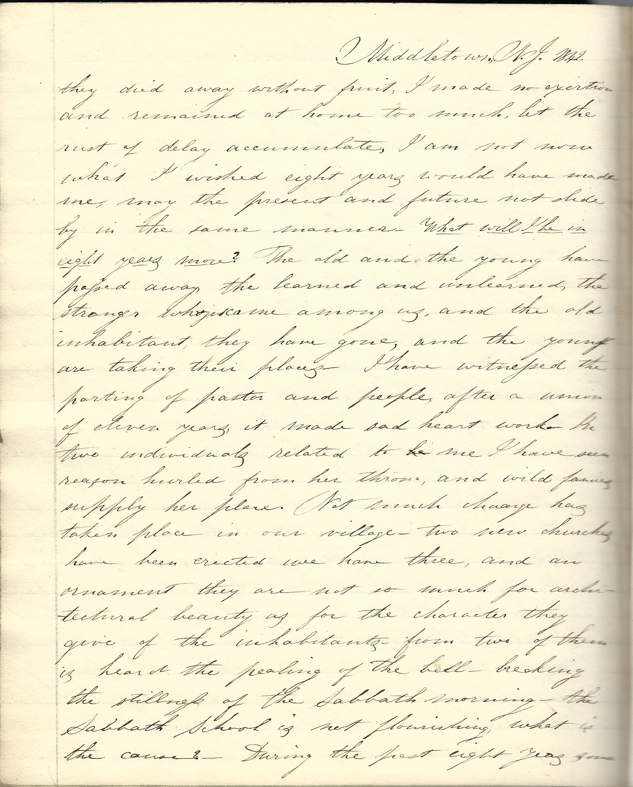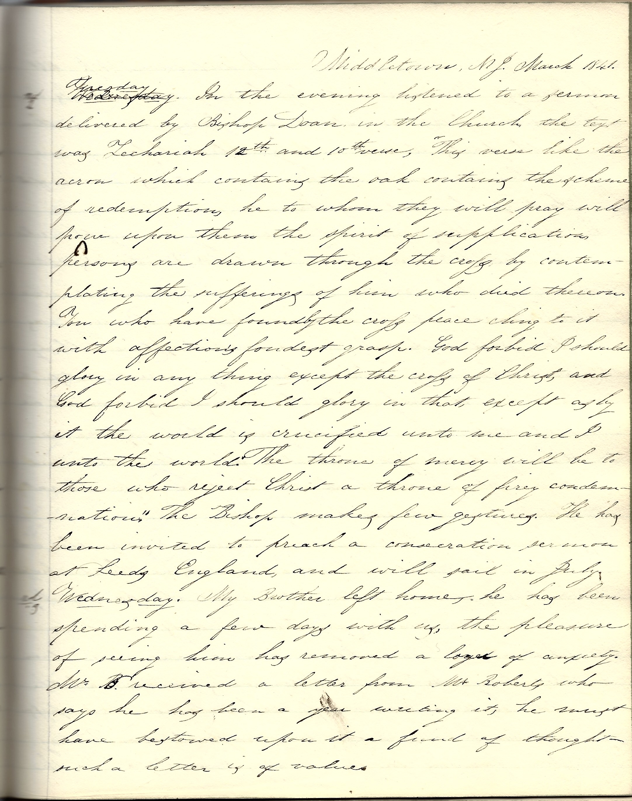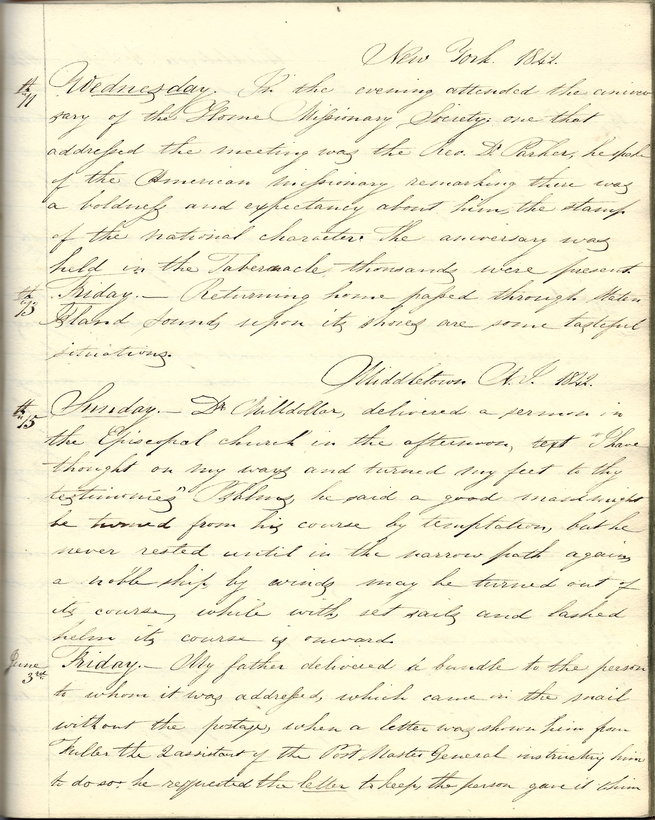 Middletown, New Jersey, Sunday, May 15, 1842. Dr. Milldollar delivered a sermon in the Episcopal Church in the afternoon, text, “I have thought on my ways and turned my feet to thy testimonies.” He said a good man might be turned in his course by temptation, but he never rested until in the narrow path again. A noble ship, by winds, may be turned out of its course, while with set sails and lashed helm, its course is onward.