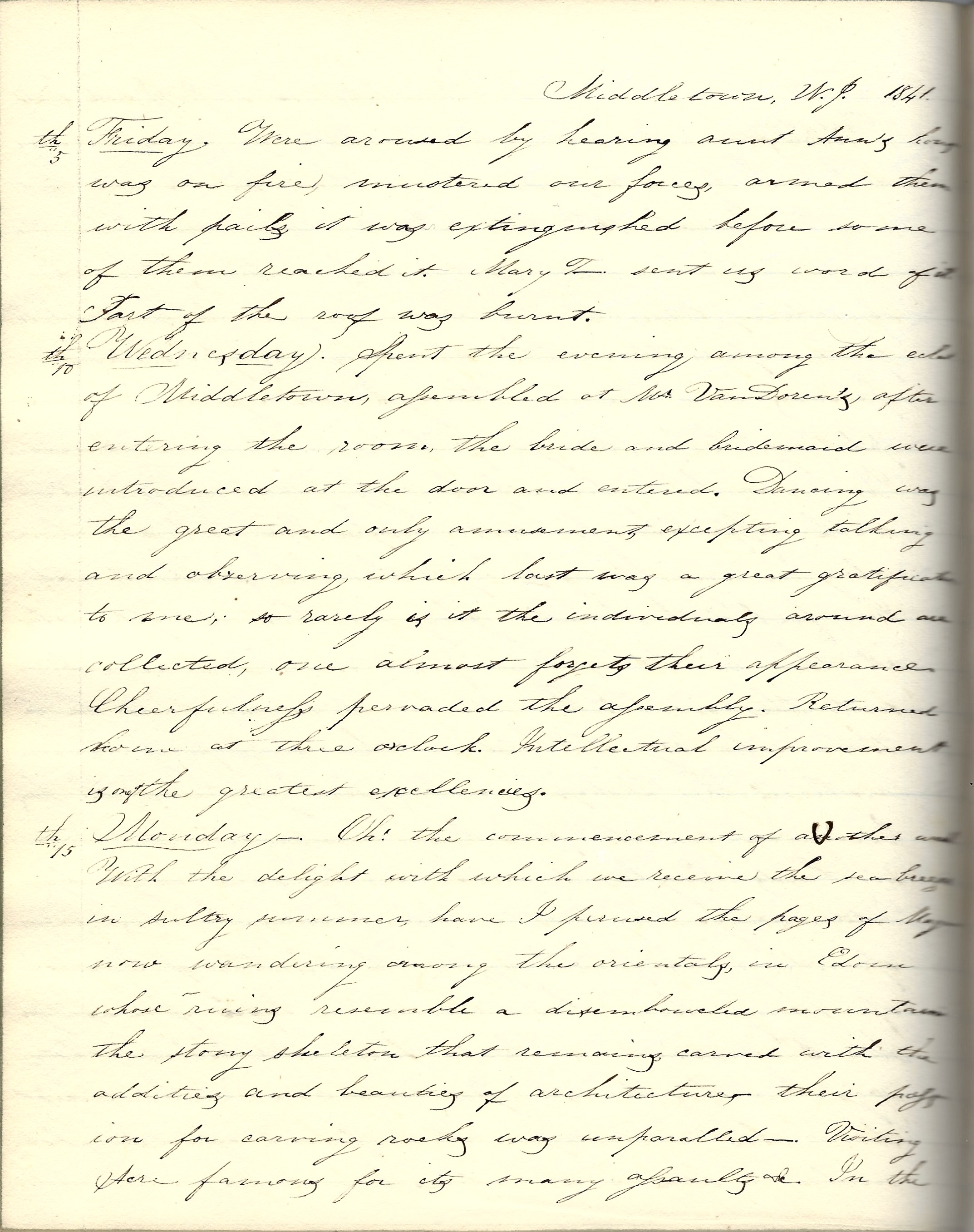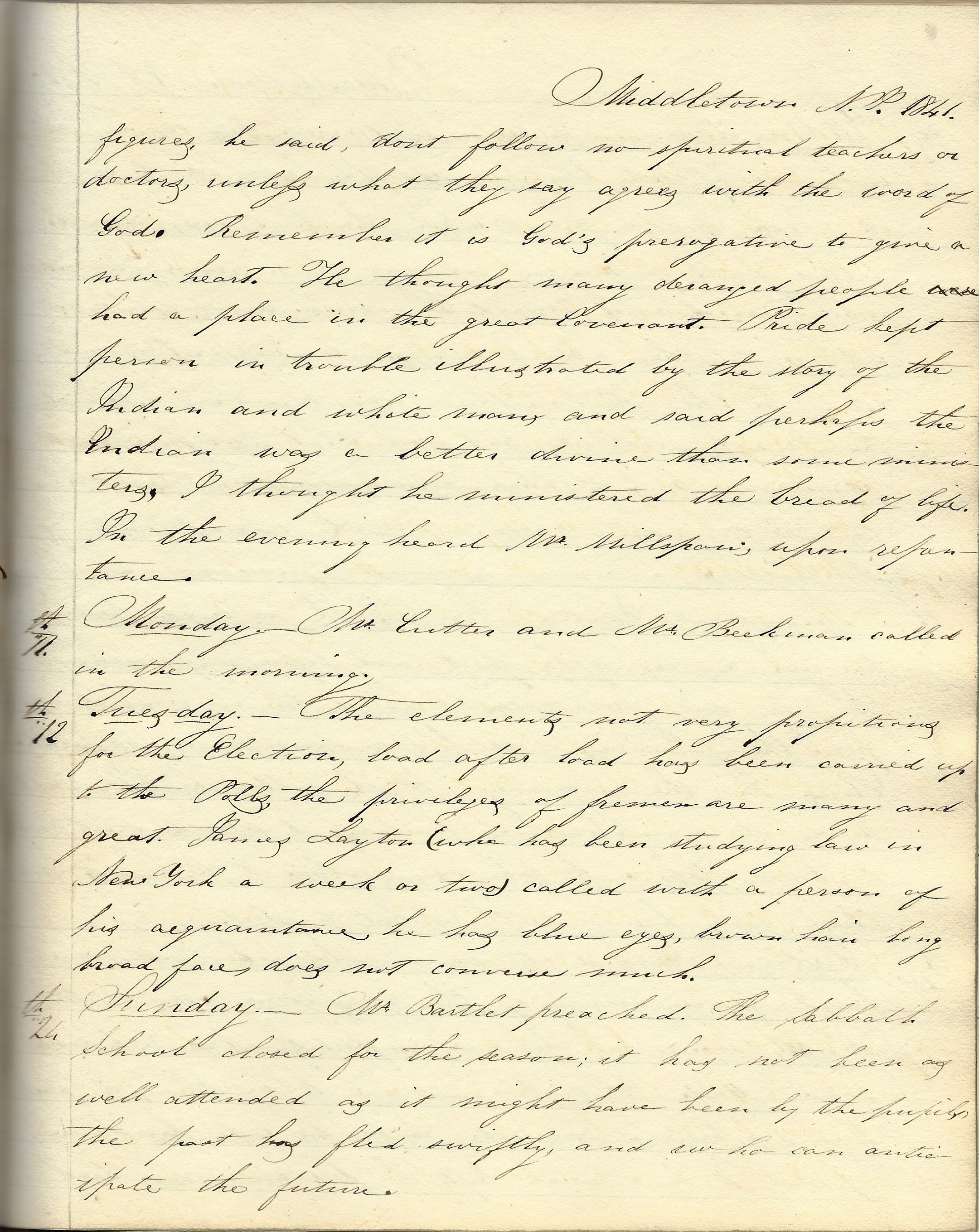 Monday 17th. Received a letter from a dear friend, L. W. D[awson]. She has been actively engaged ever since leaving school in teaching. Has now eighty or ninety to direct in the paths of knowledge and virtue. I consider it providential. Mr. Ketcham has now a protracted meeting in progress at Holmdel. It commenced on Wednesday last. A Baptist church has also been constituted at Key Port a fortnight past or three weeks on Wednesday.
