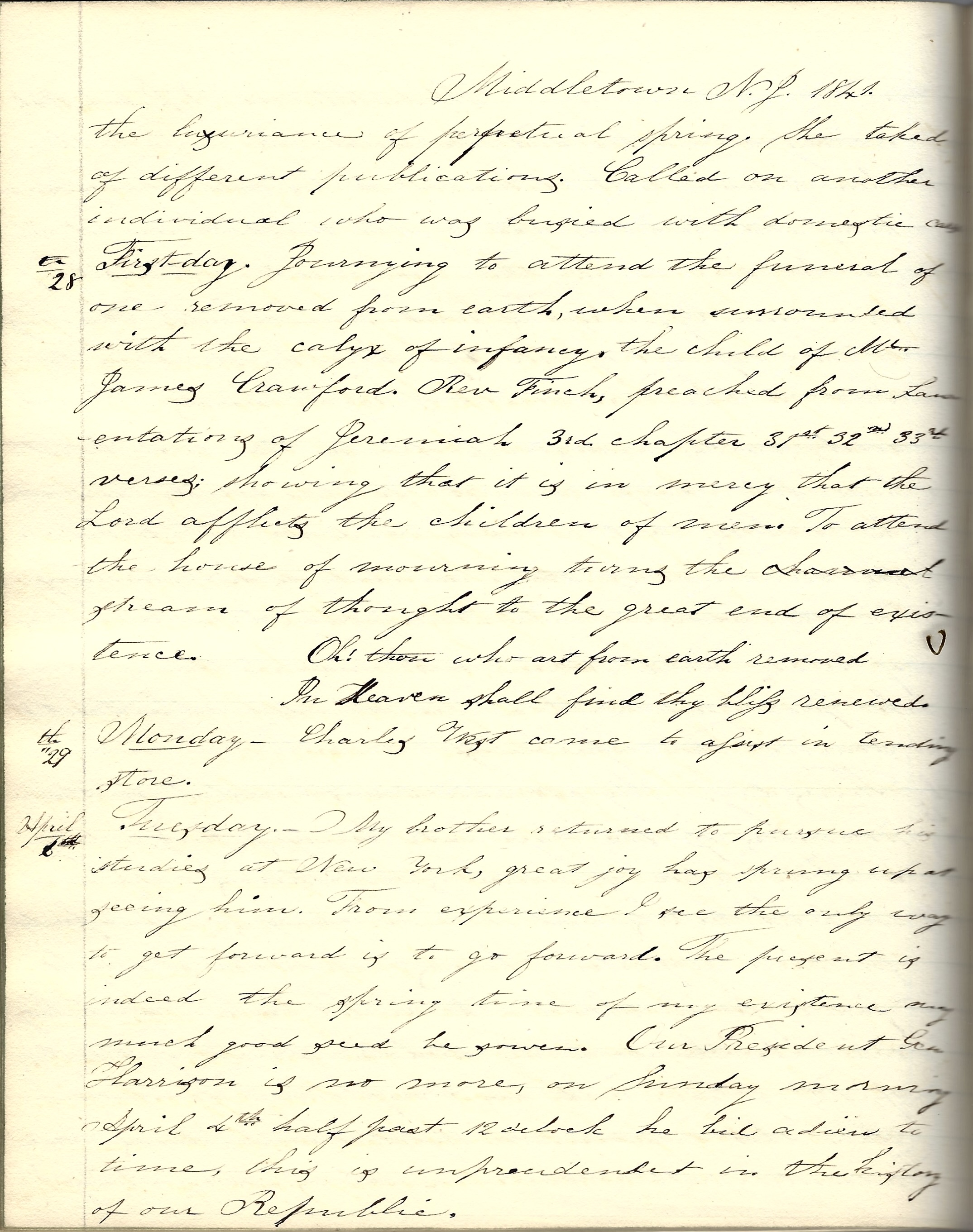 Tuesday, April 6th. My brother returned to pursue his studies at New York. Great joy has sprung up at seeing him. From experience, I see the only way to get forward is to go forward. The present is indeed the spring time of my existence, May much good seed be sown.