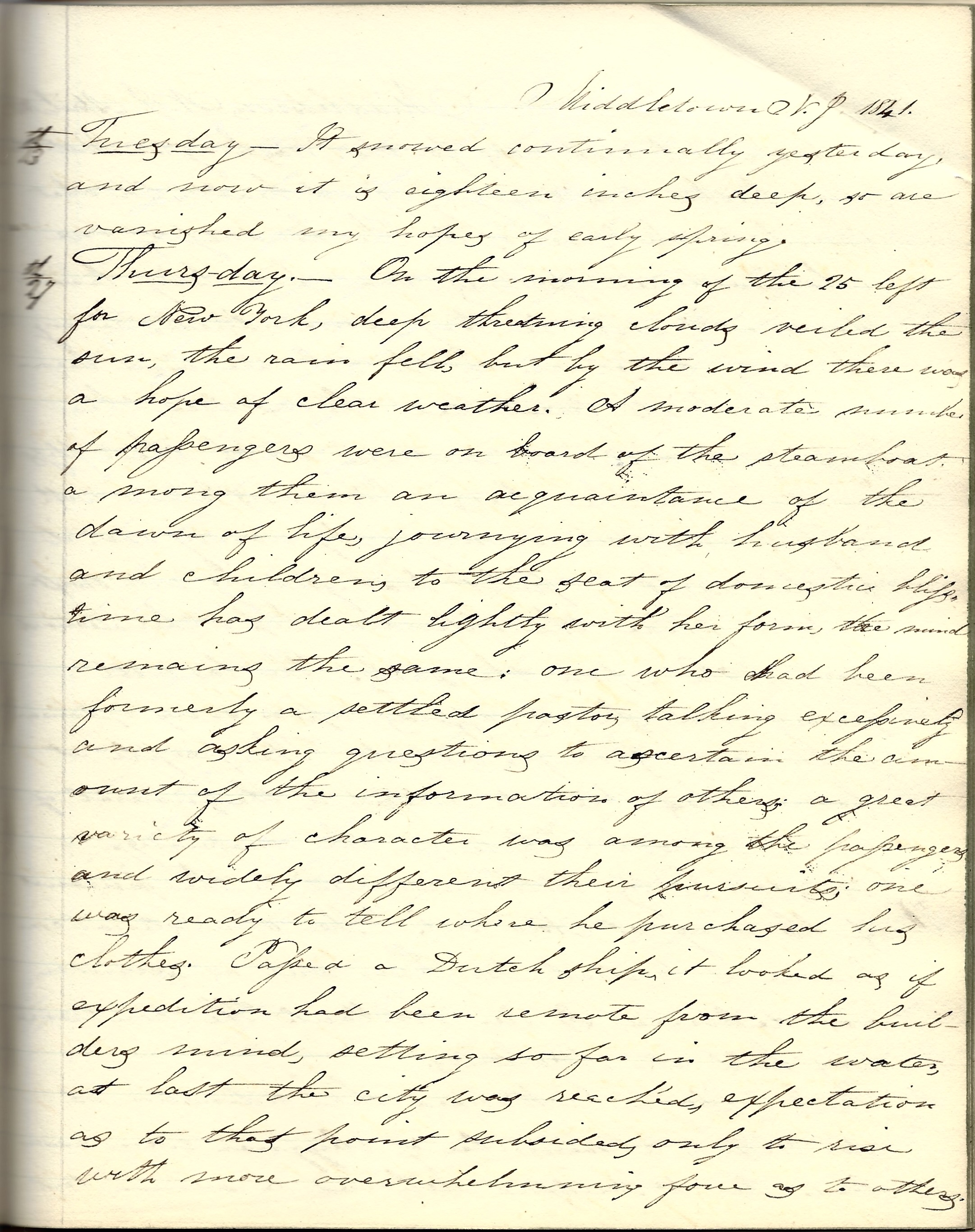 Thursday 27th. On the morning of the 25th, left for New York. Deep threatening clouds veiled the sun. The rain fell but by the wind, there was a hope of clear weather. A moderate number of passengers were on board of the steamboat. Among them an acquaintance of the dawn of life, journeying with husband and children to the seat of domestic bliss. Time has dealt lightly with her form. The mind remains the same. [There was also] one who had been formerly a settled pastor, talking excessively and asking questions to ascertain the amount of the information of others. A great variety of character was among the passengers and widely different their pursuits. One was ready to tell where he purchased his clothes. Passed a Dutch ship. It looked as if expedition had been remote from the builder’s mind, setting so far in the water.