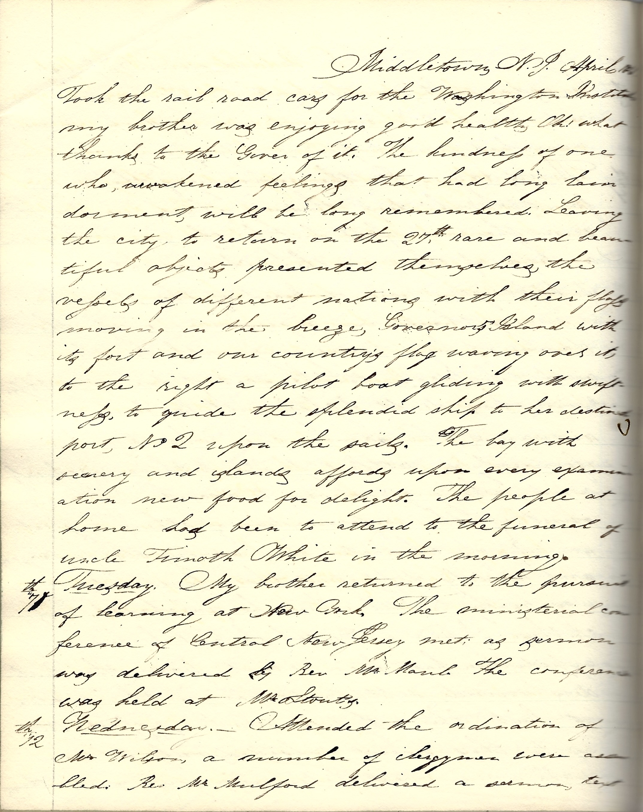 At last the city was reached, expectation as to that point subsided only to rise with more overwhelming force as to others. Took the railroad cars for the Washington Institute. My brother was enjoying good health. Oh! what thanks to the Giver of it. The kindness of one who awakened feelings that had long lain dormant will be long remembered. Leaving the city to return on the 27th. Rare and beautiful objects presented themselves. the vessels of different nations with their flags moving in the breeze, Governor’s Island with its fort and our country’s flag waving over it. to the right a pilot boat gliding with swiftness to guide the splendid ship to her destined port, No. 2 upon the sails. The bay with scenery and islands affords upon every examination new food for delight. The people at home had been to attend to the funeral of Uncle Timothy White in the morning.