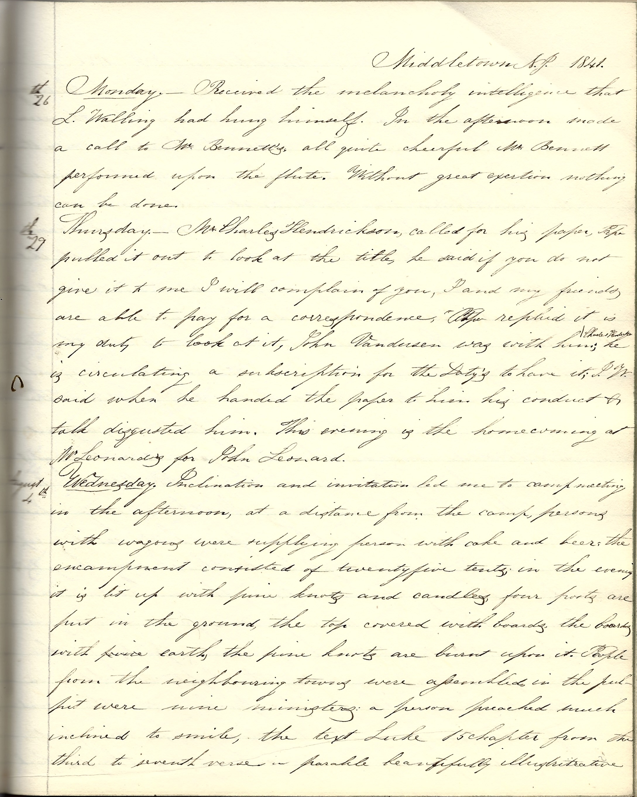 Monday 26th. Received the melancholy intelligence that L[eonard] Walling [of Holmdel] had hung himself. In the afternoon made a callto Mr. Bennett’s. All quite cheerful. Mr. Bennett performed upon the flute. Without great exertion, nothing can be done.