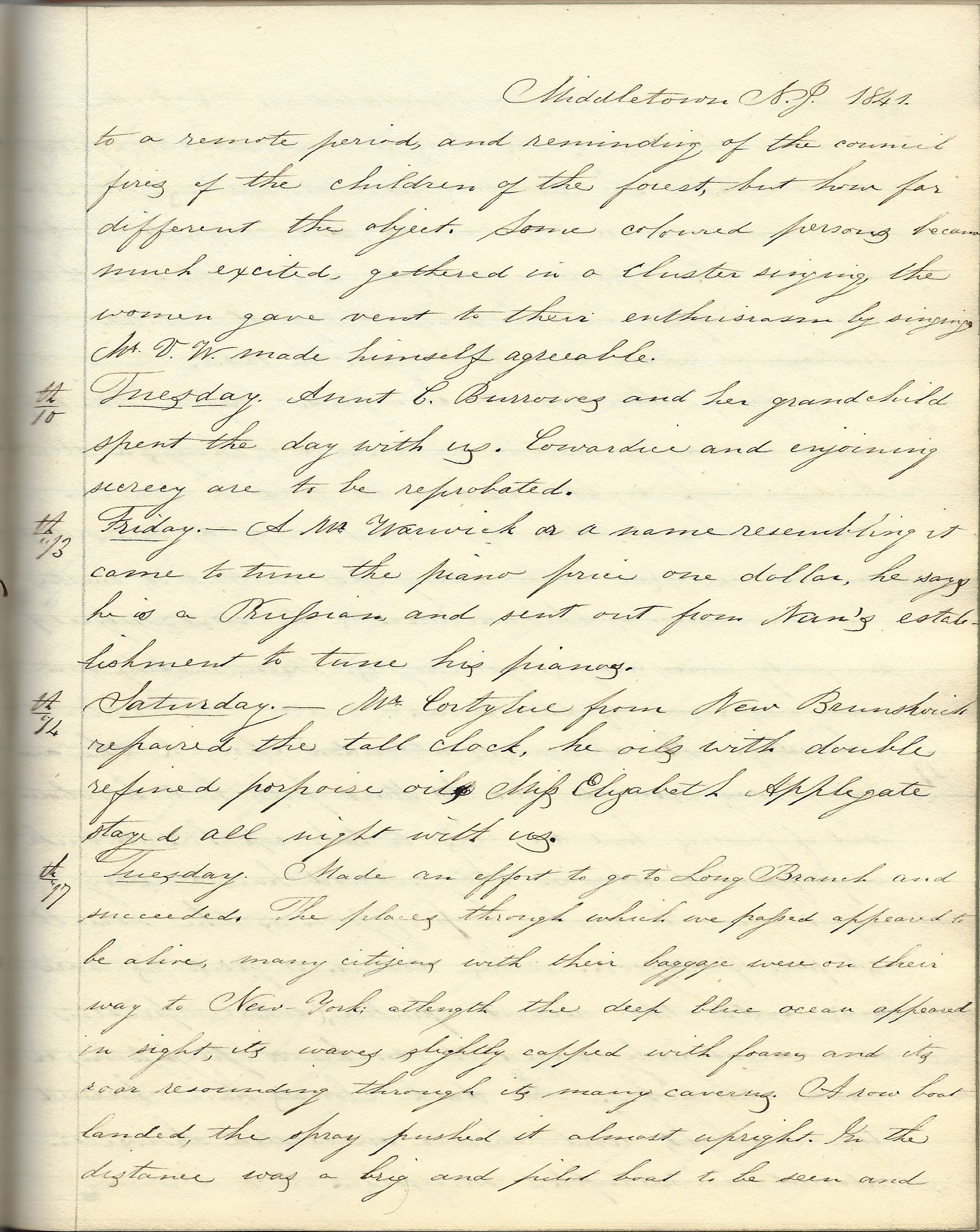 Tuesday 17th. Made an effort to go to Long Branch and succeeded. The places through which we passed appeared to be alive. Many citizens with their baggage were on their way to New York. Although the deep blue ocean appeared in sight, its waves slightly capped with foam and its roar resounding through its many caverns. A row boat landed. The spray pushed it almost upright. In the distance was a brig and pilot boat to be seen and just on the verge of the horizon, more schooners from the South. The boarders were numerous. Some visitors from up in the country had come to look at the sea. The parlor was plain, garnished with a glaring carpet in which yellow predominated. A history of New Jersey laid upon the table.
