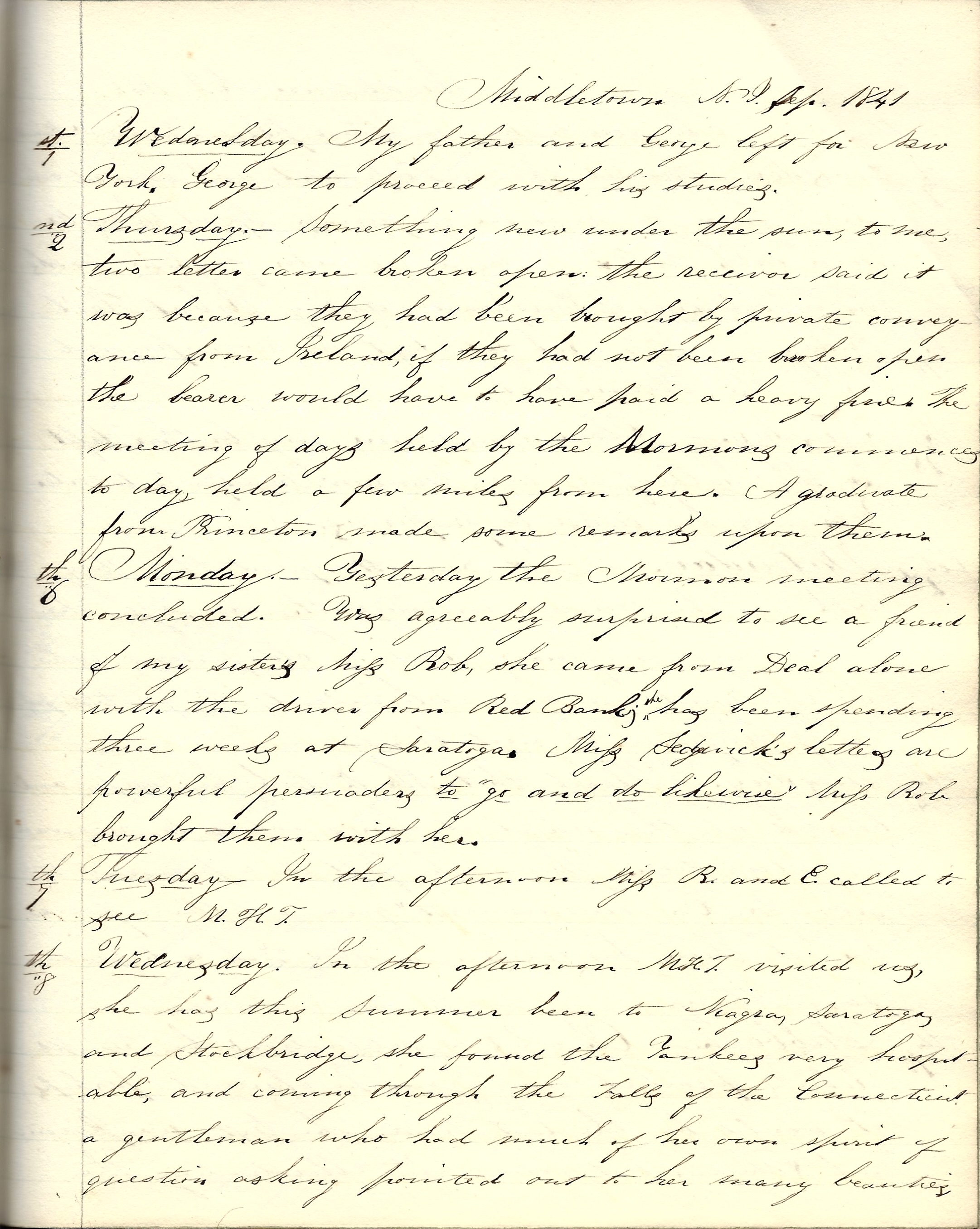 Middletown, New Jersey, September 1, 1841. My father and George left for New York. George to proceed with his studies.