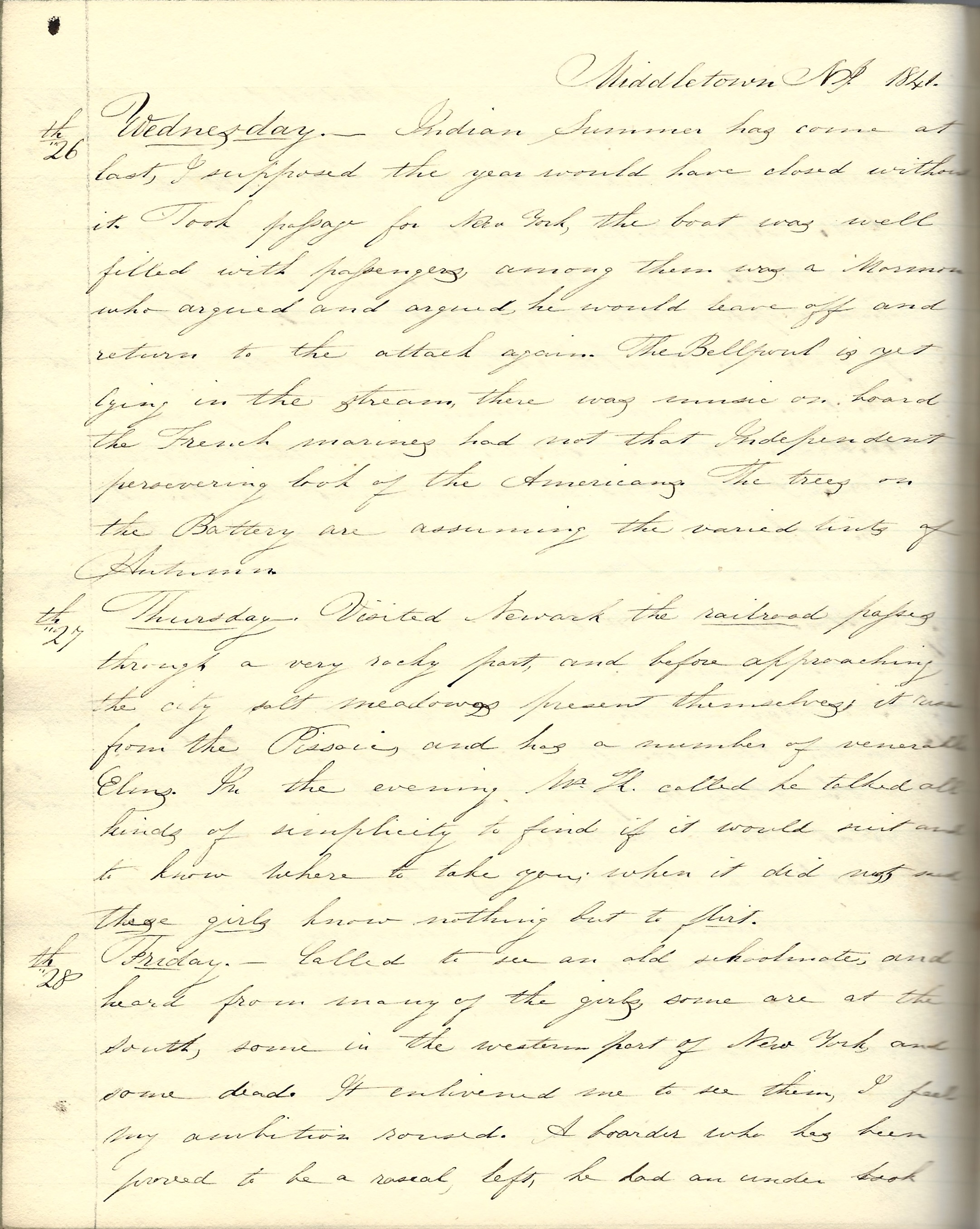 Wednesday 26th. Indian summer has come at last. I supposed the year would have closed without it. Took passage for New York. The boat was well filled with passengers. Among them was a Mormon who argued and argued. He would leave off and return to the attack again. The Bellfont[e] is yet lying in the steam. There was music on board. The French marines had not that independent, persevering look of the Americans. The trees on the Battery are assuming the varied tints of Autumn.