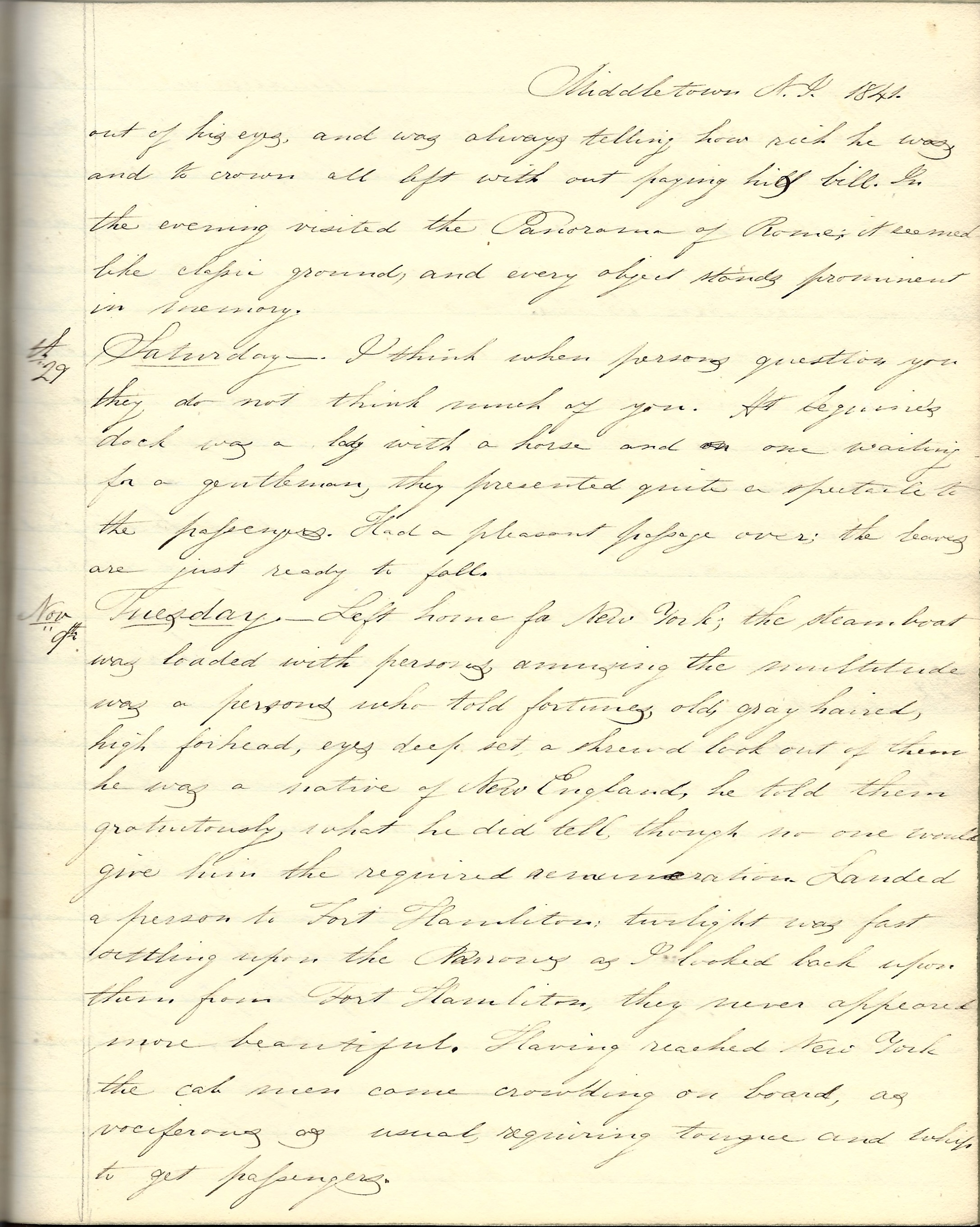 Tuesday, November 9, 1841. Left home for New York. The steamboat was loaded with passengers. Amusing the multitude was a person who told fortunes—old, gray haired, high forehead, eyes deep set [with] a shrewd look out of them. He was a native of New England. He told them gratuitously what he did tell, though no one would give him the required remuneration.