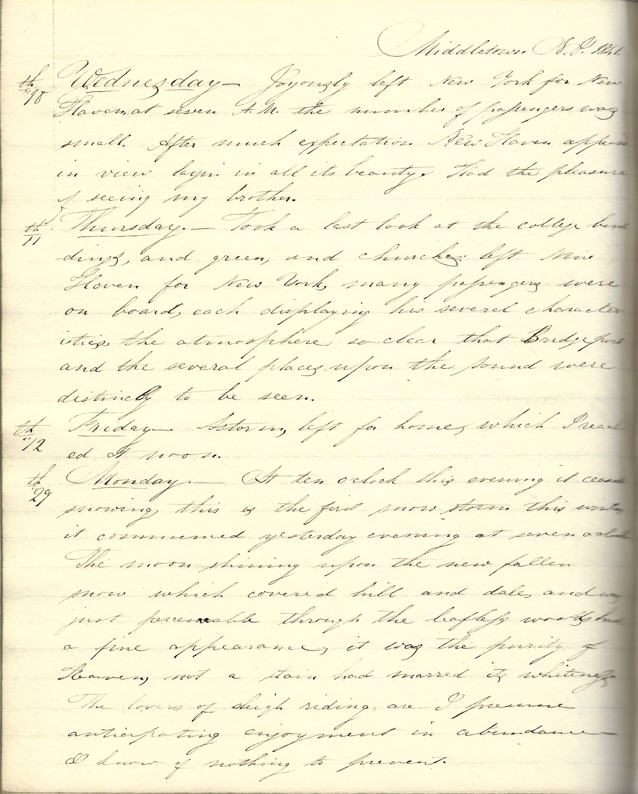 Thursday 11th. Took a last look at the college buildings and green, and churches. Left New Haven for New York. Many passengers were on board, each displaying his several characteristics. The atmosphere was so clear that Bridgeport and several [other] places upon the Sound were distinctly to be seen.
