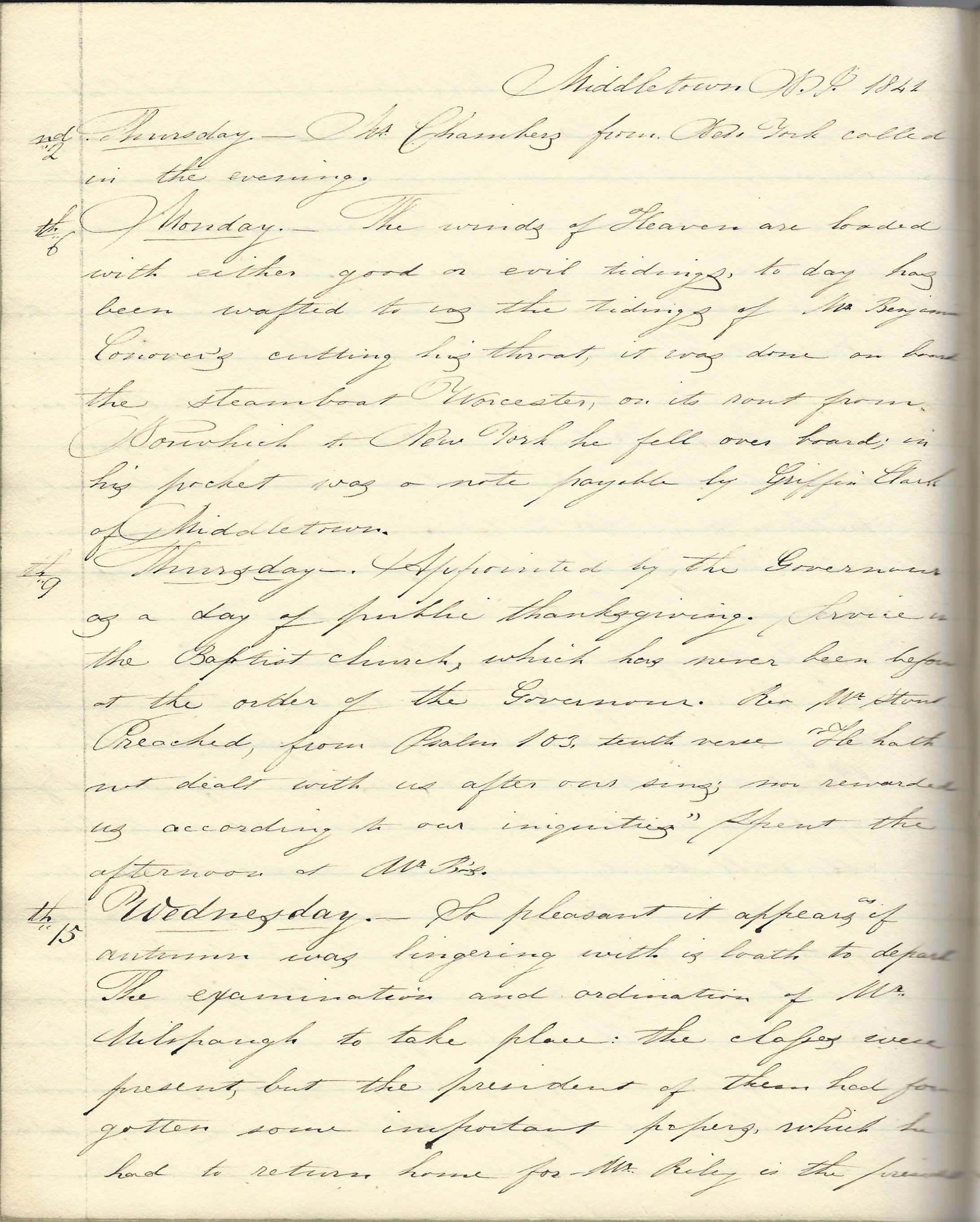 Monday 6th. The winds of Heaven are loaded with either good or evil tidings. Today has been wafted to us the tidings of Mr. Benjamin Conover’s cutting his throat. It was done on board the steamboat Worcester on its rout from Norwich to New York. He fell over board. In his pocket was a note payable by Griffin Clark of Middletown.