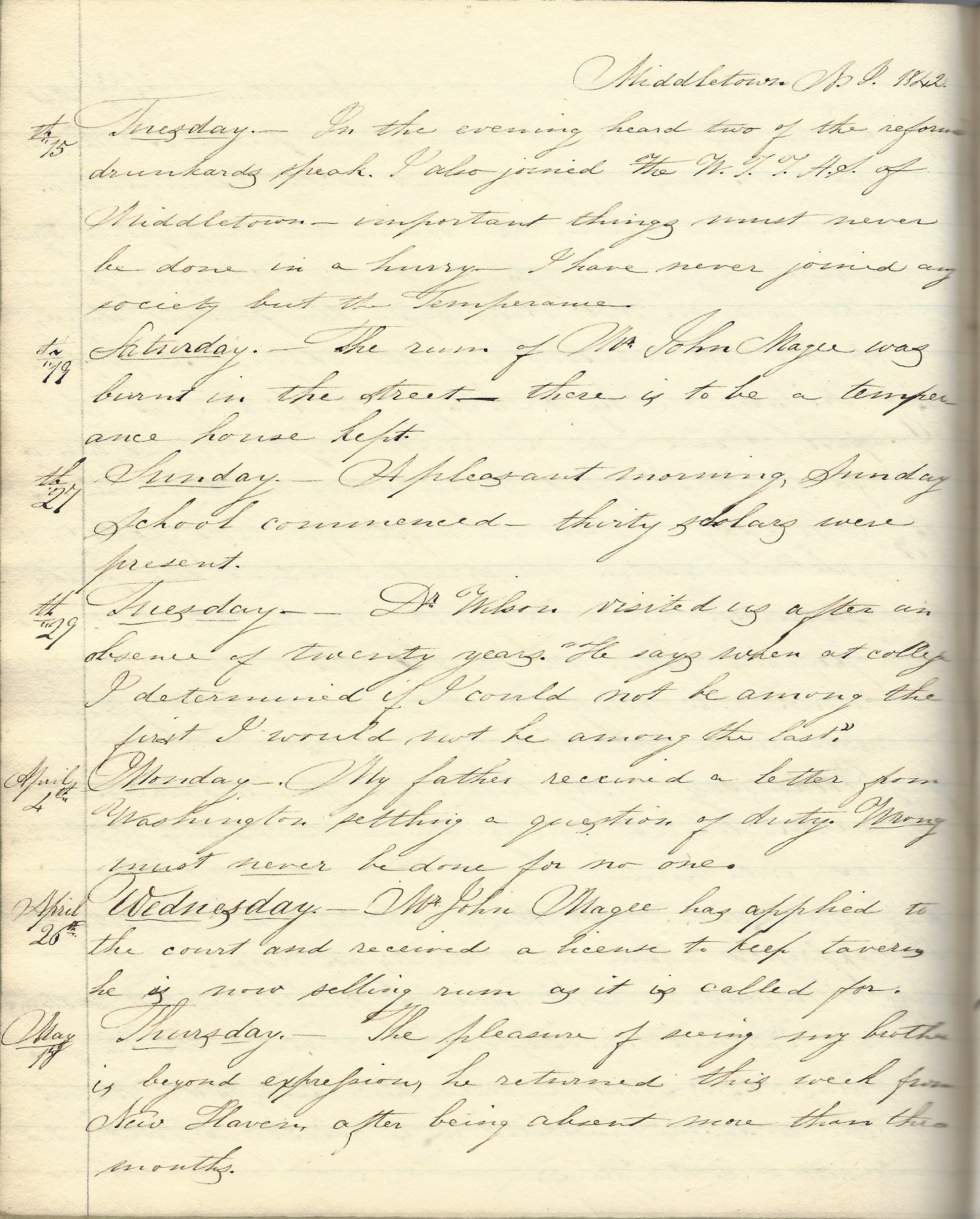 Tuesday, 15th. In the evening heard two of the reformed drunkards speak. I also joined the W. T. T. A. S. [Washingtonian Temperance Total Abstinence Society] of Middletown—important things must never be done in a hurry. I have never joined any society but the Temperance.