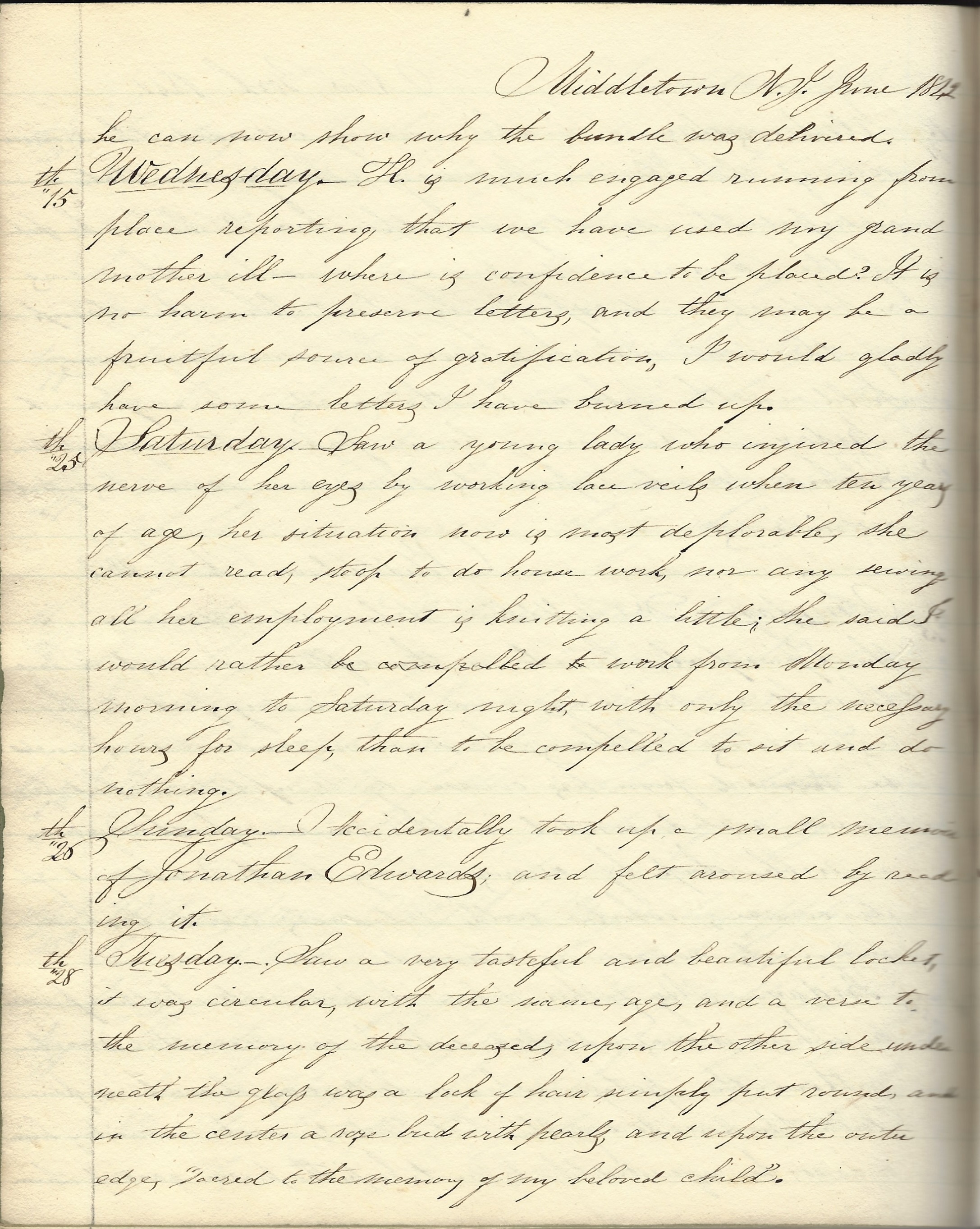 Saturday 25th. Saw a young lady who injured the nerve of her eyes by working lace veils when ten years of age. Her situation now is most deplorable. She cannot read, stoop to do house work, nor any sewing. All her employment is knitting a little. She said I would work from Monday morning to Saturday night with only the necessary hours for sleep than to be compelled to sit and do nothing.