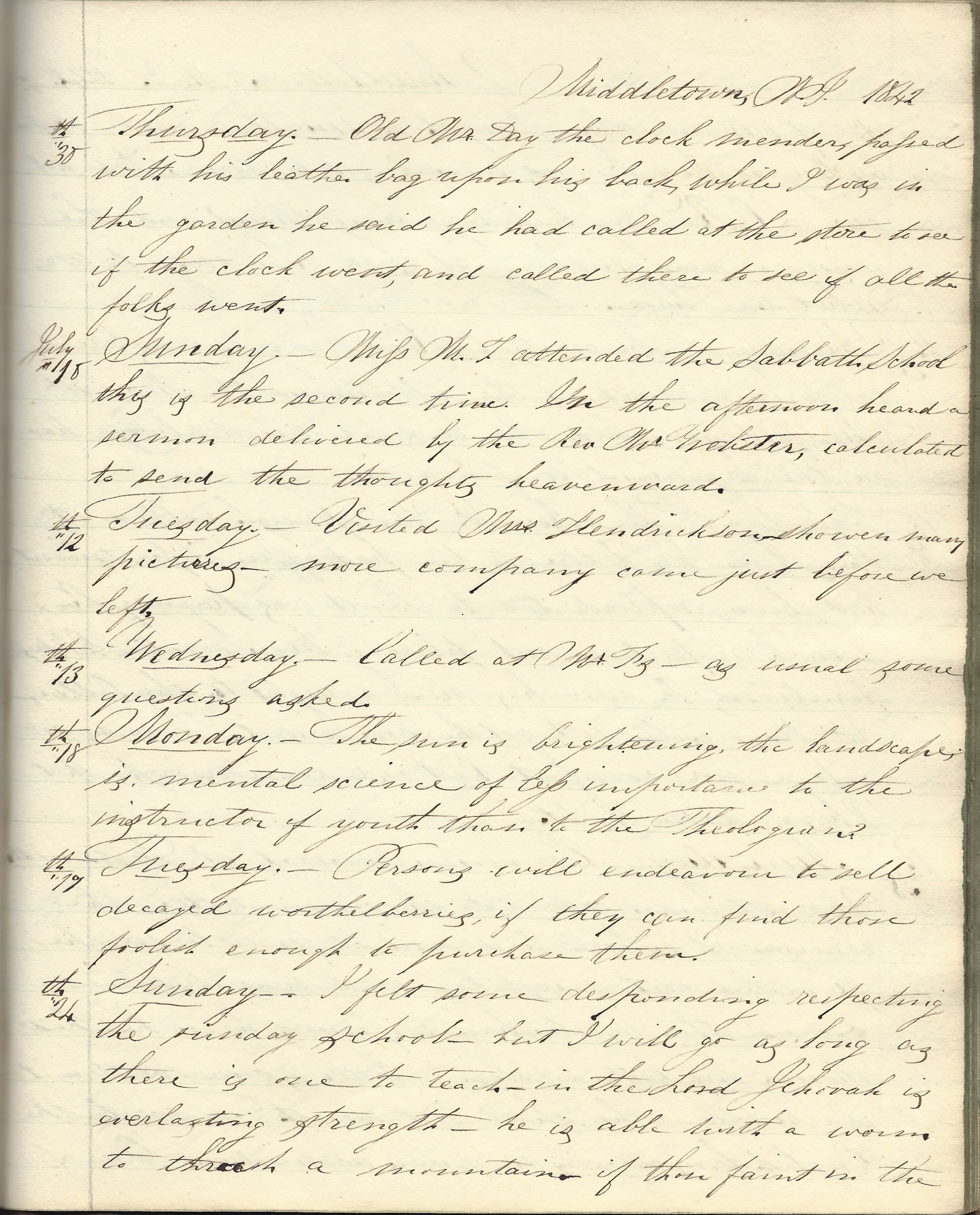 Monday, July 10, 1842. Miss M. T. attended the Sabbath School. This is the second time. In the afternoon heard a sermon delivered by the Rev. Mr. Webster calculated to send hte thoughts heavenward.