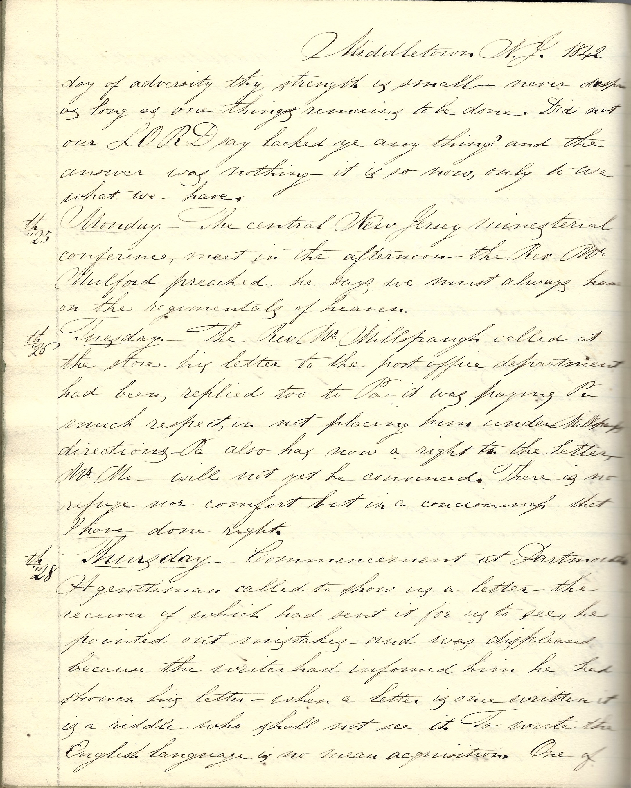 Monday 25th. The Central New Jersey Ministerial Conference met in the afternoon. The Rev. Mulford preached. He says we must always have on the regimentals of heaven.