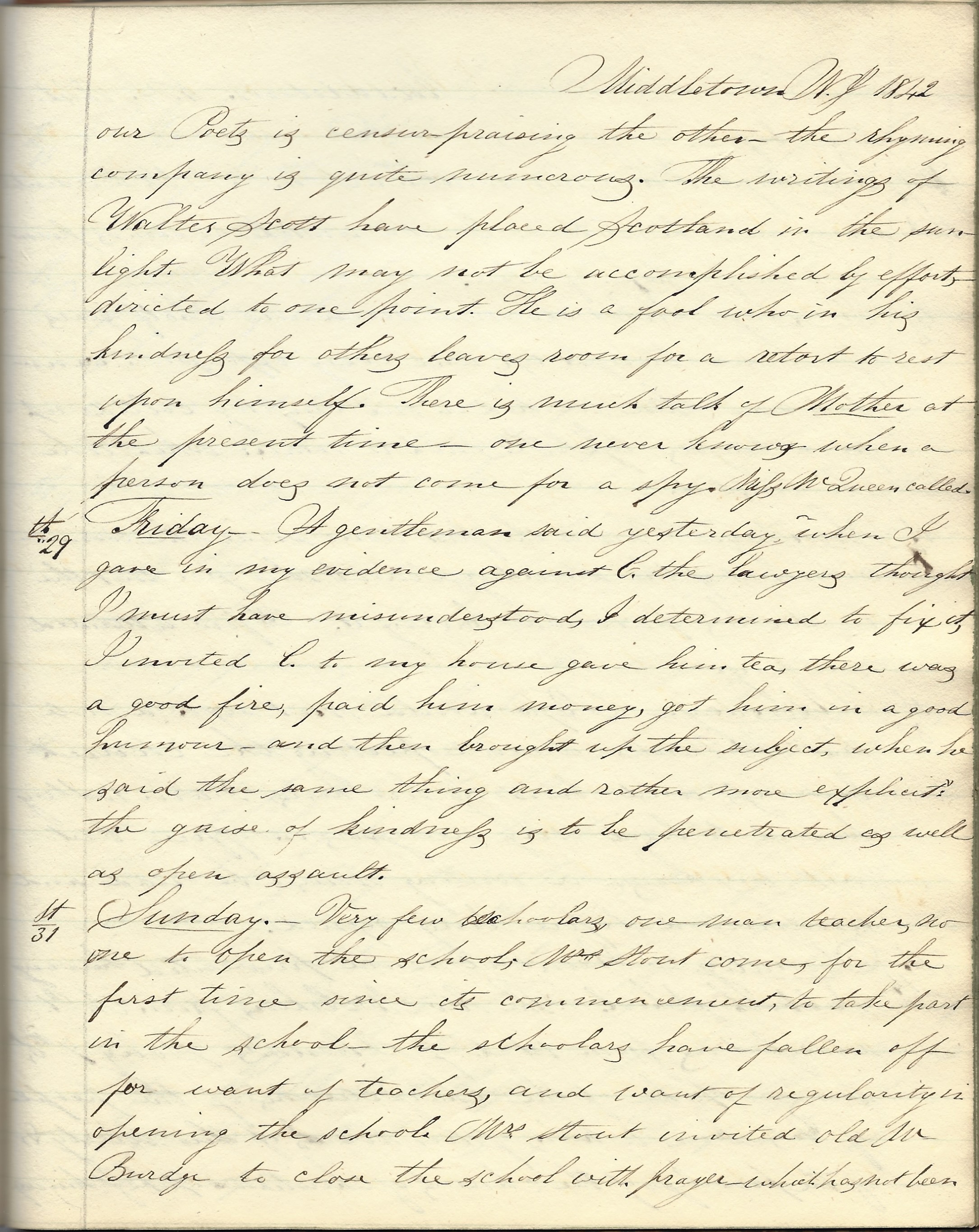 Sunday 31st. Very few scholars. One man teacher. No one to open the schools. Mrs. Stout came for the first time since its commencement to take part in the school. The scholars have fallen off for want of teachers, and want of regularity in opening the schools. Mrs. Stout invited old Mr. Burdye to close the school with prayer which has not been done before.