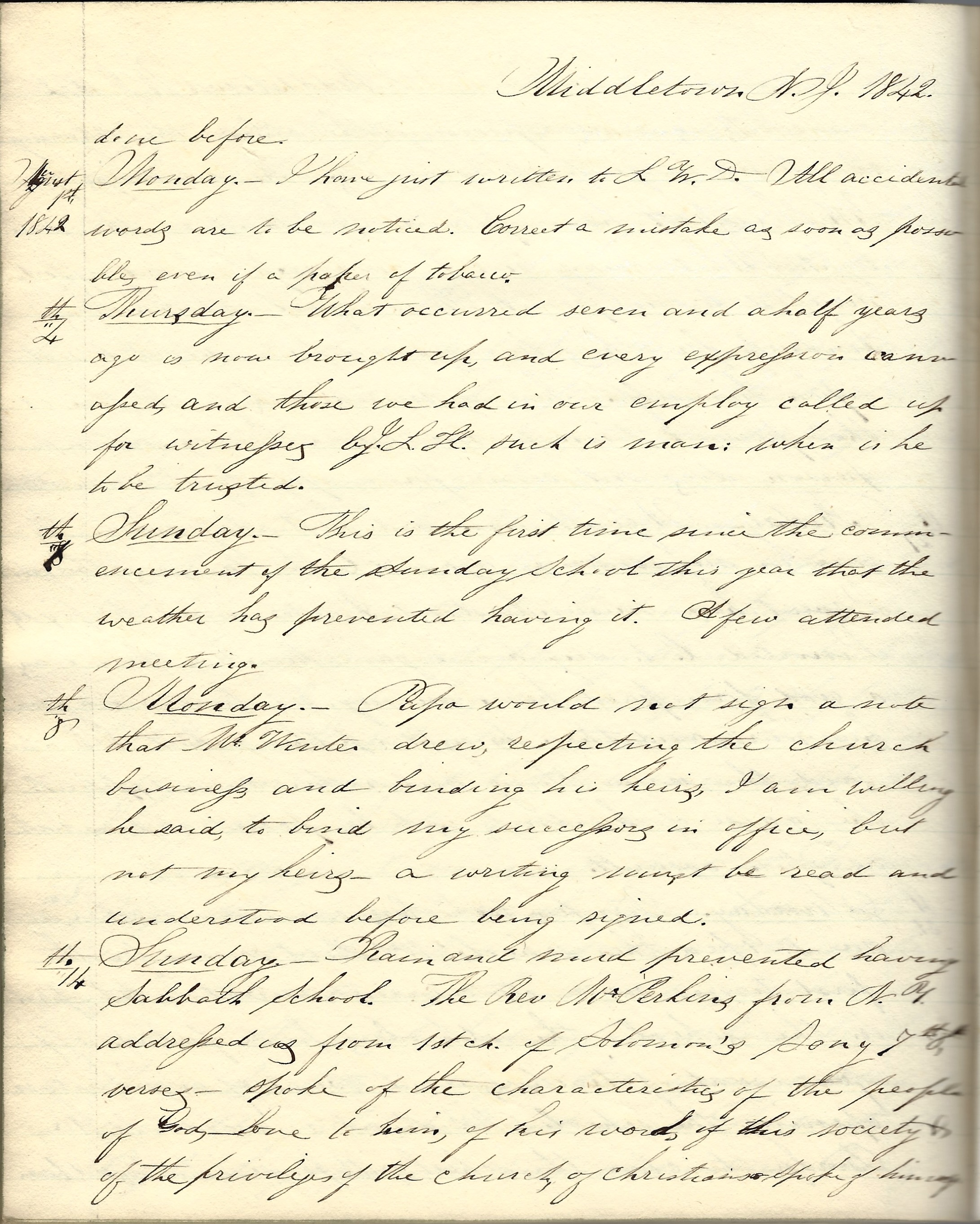 Middletown, New Jersey, Monday, August 1, 1842. I have just written to L. W. D. All accidental words are to be noticed. Correct a mistake as soon as possible even if a paper of tobacco.