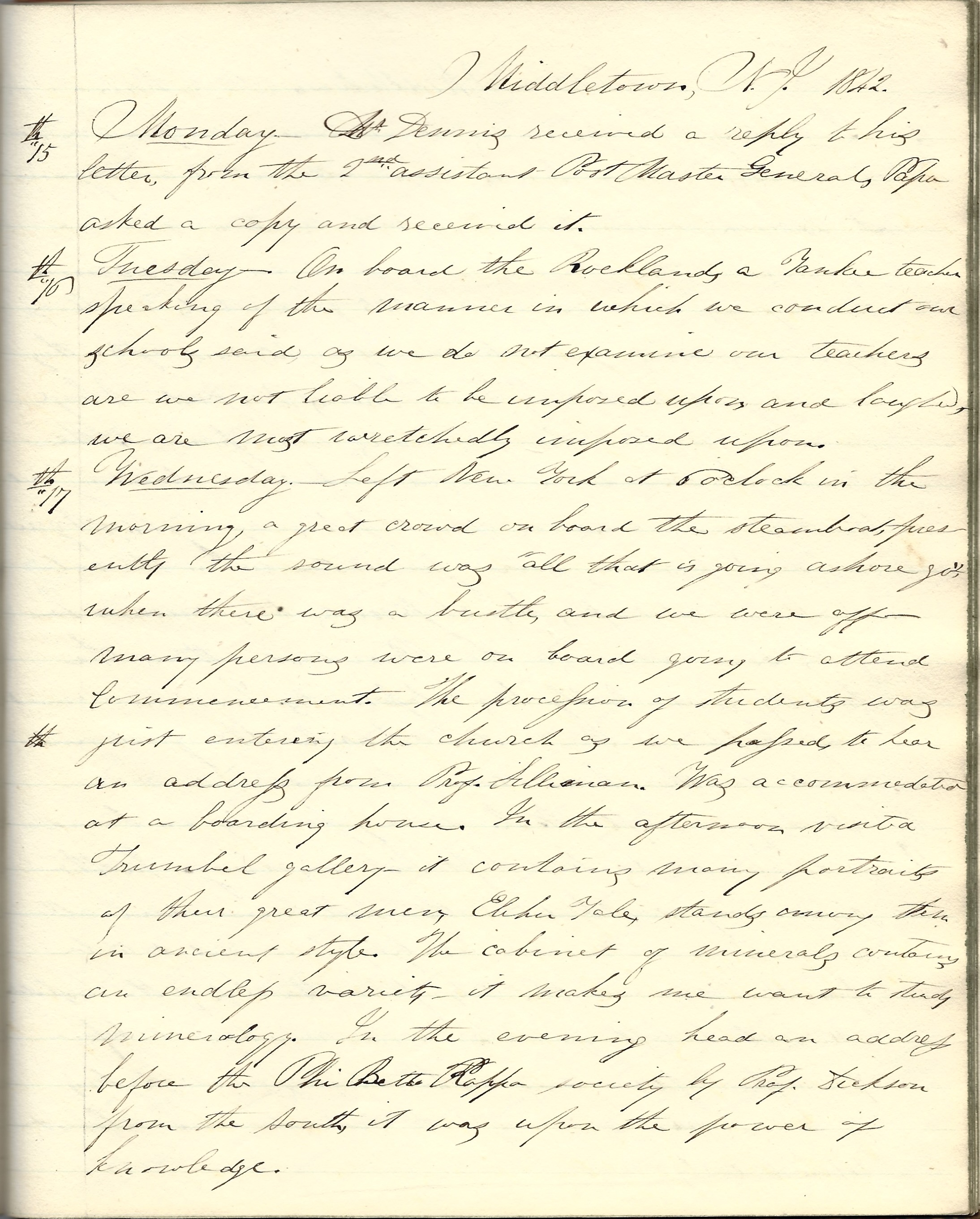 Wednesday 17th. Left New York at 6 o’clock in the morning. A great crowd on board the steamboat. Presently the sound was “all this is going ashore, go!” when there was a bustle and we were off. Many persons were on board going to attend the commencement [at Yale]. The procession of students was just entering the church & we passed to hear an address from Prof. Silliman. Was accommodated at a boarding house. In the afternoon visited Trumble Gallery. It contains many portraits of their great men. Elisha Yale stands among them in ancient style. The cabinet of the minerals containing an endless variety. It makes me want to study mineralogy. In the evening heard an address before the Phi Beta Kappa Society of Prof. [Samuel Henry] Dickson from the South. It was upon the power of knowledge.