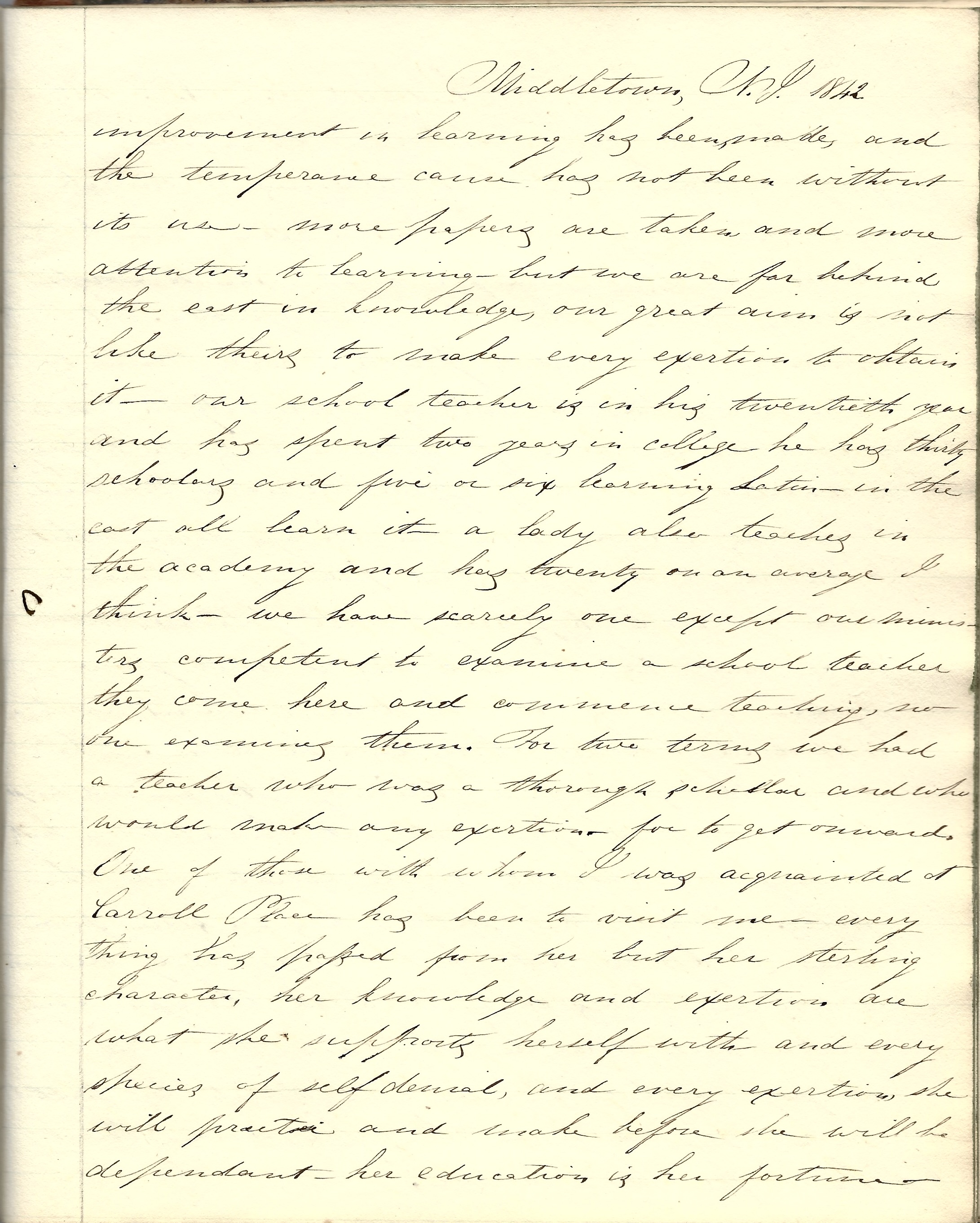 Not much change has taken place in our village—two new churches have been erected. We have three and an ornament they are, not so much for architectural beauty as for the character they give of the inhabitants. From two of them is heard the pealing of the bell, breaking the stillness of the Sabbath morning. The Sabbath School is not flourishing—what is the cause? During the past eight years some improvement in learning has been made and the temperance cause has not been without its use. More papers are taken and more attention to learning, but we are far behind the East in knowledge. Our great aim is not like theirs—to make every exertion to obtain it. Our school teacher [Austin] is in his twentieth year and has spent two years in college. He has thirty scholars and five or six learning Latin. In the East, all learn it. A lady also teaches in the Academy and has twenty on an average I think. We have scarcely one except our ministers competent to examine a school teacher. They come here and commence teaching, no one examining them. For two terms we had a teacher who was a thorough scholar and who would make any exertion for to get onwards. One of these with whom I was acquainted at Carroll Place has been to visit me. Everything has passed from her but her sterling character, her knowledge, and exertion are what she supports herself with and every species of self-denial, and every exertion she will practice and make before she will be dependent. Her education is her fortune.